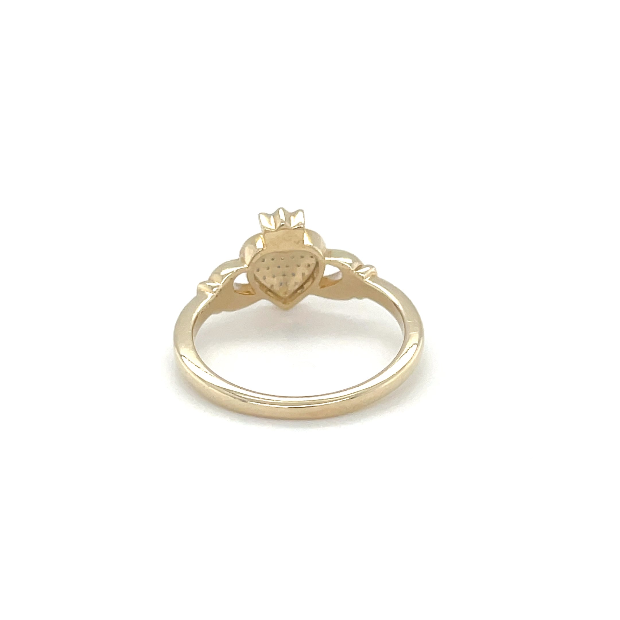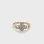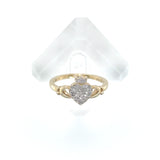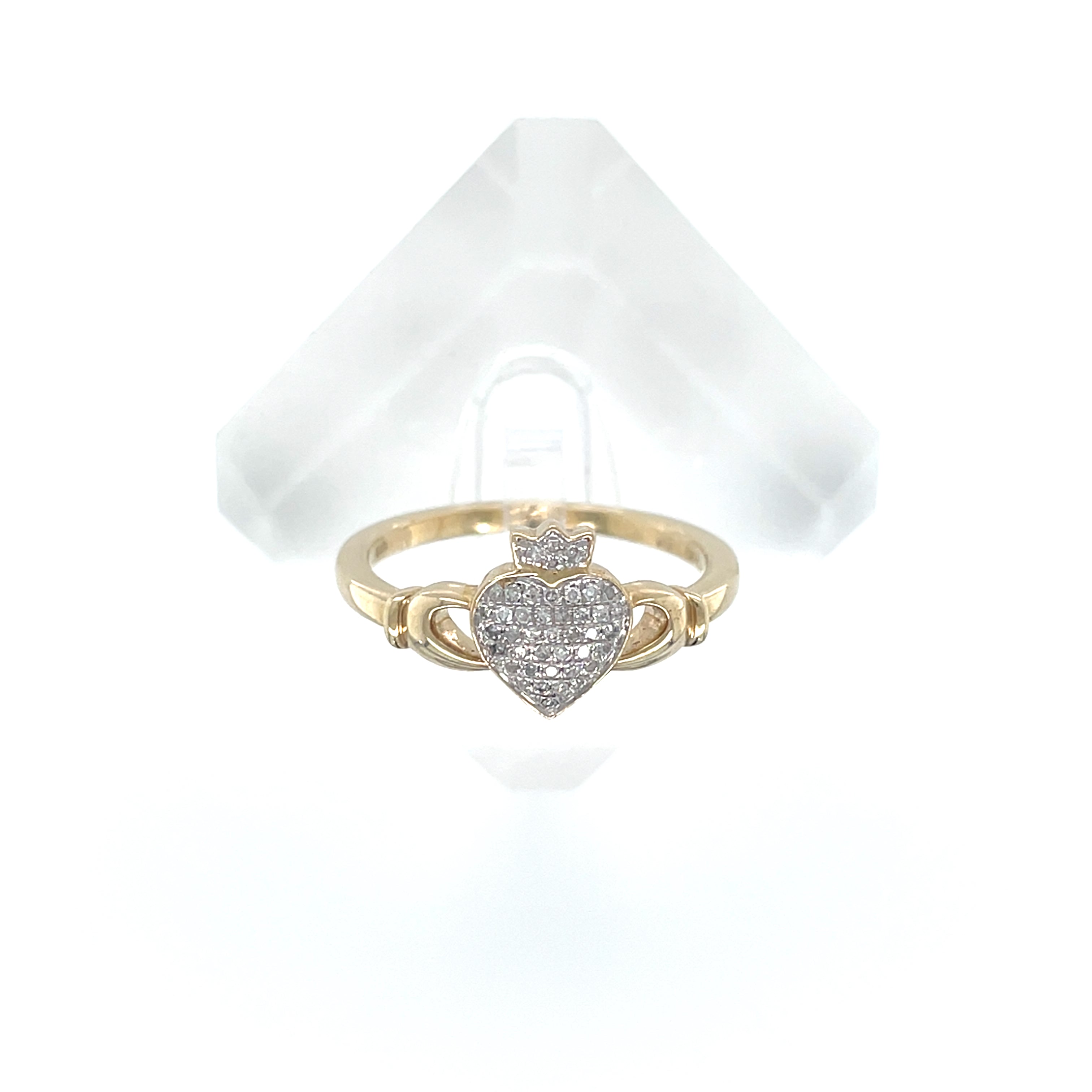 This stunning 10K yellow gold claddagh ring features a heart-shaped design adorned with sparkling diamonds. The ring is size 7 and crafted with high-quality materials, making it a perfect addition to any jewelry collection. The ring is also sizable, ensuring a comfortable fit for any finger. The vibrant yellow gold color adds a touch of elegance to the piece, making it ideal for both casual and formal occasions. Whether you're looking for a gift or simply treating yourself, this beautiful ring is sure to impress.