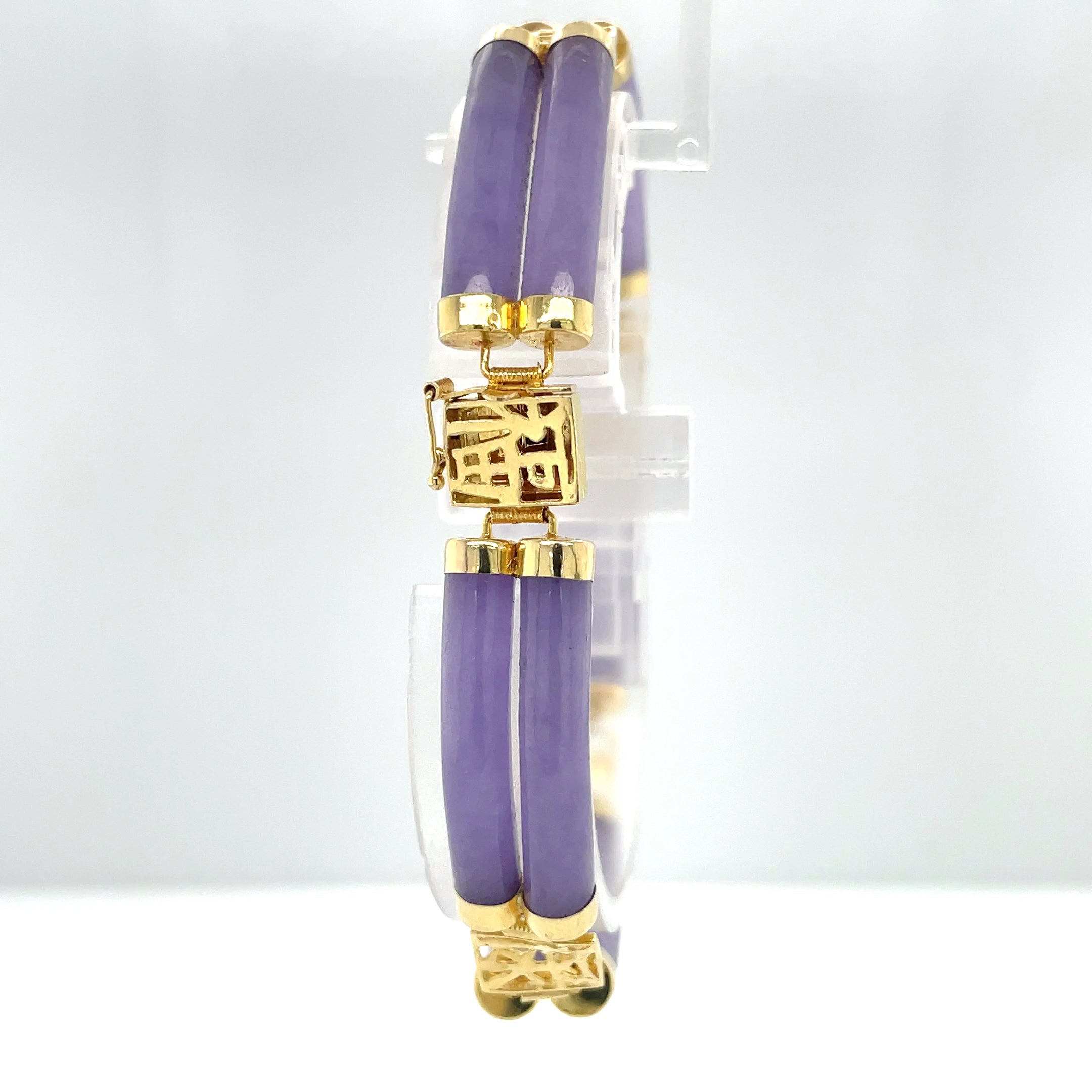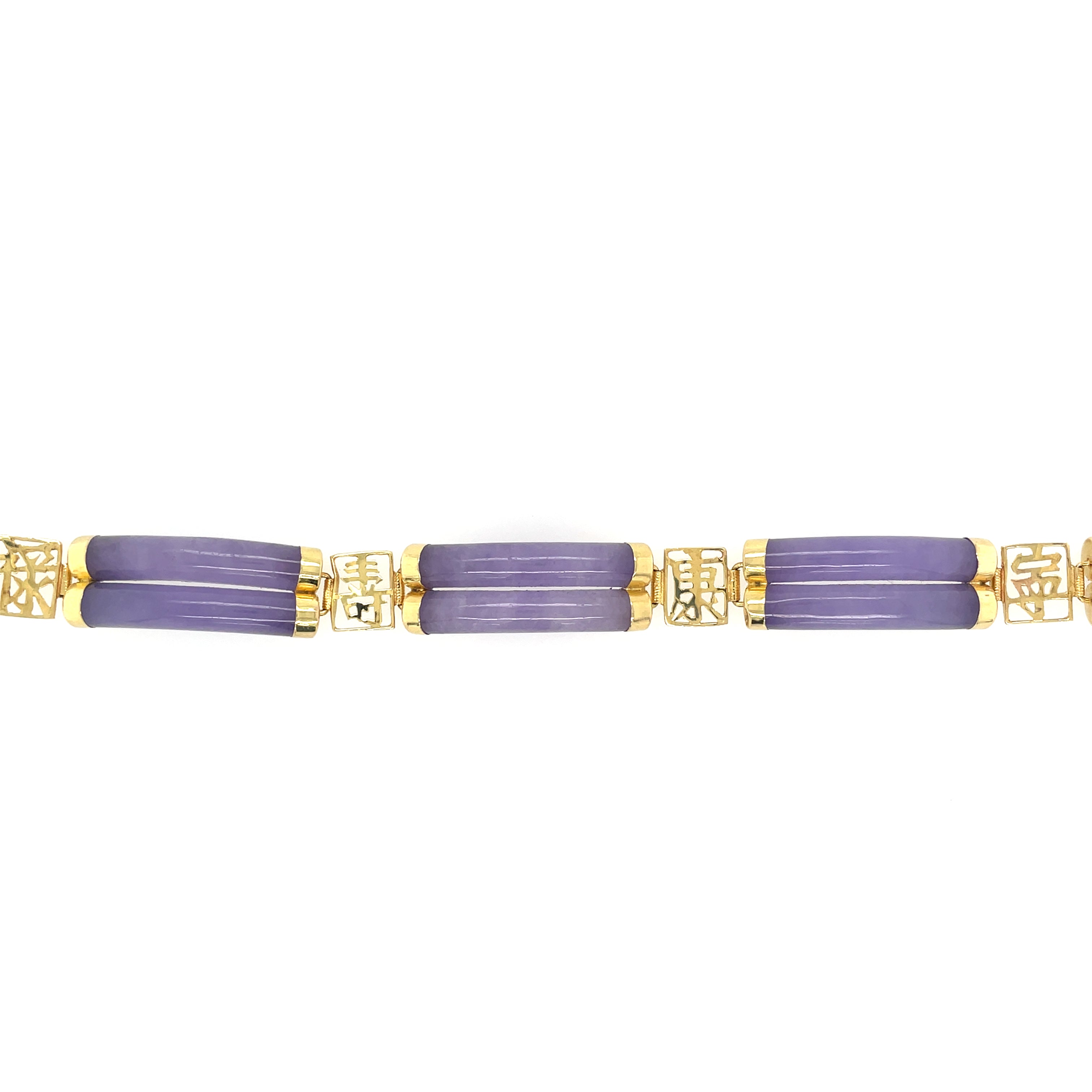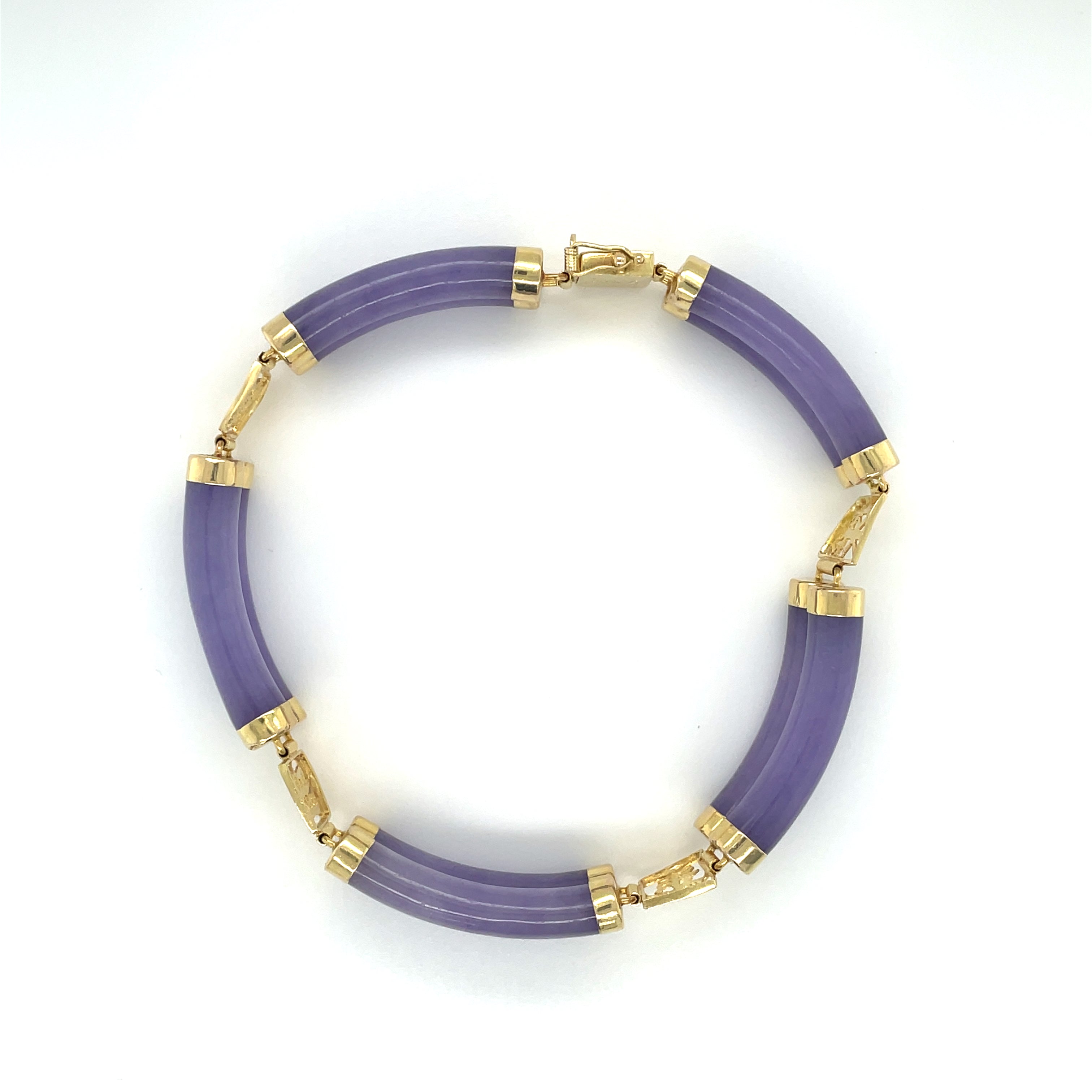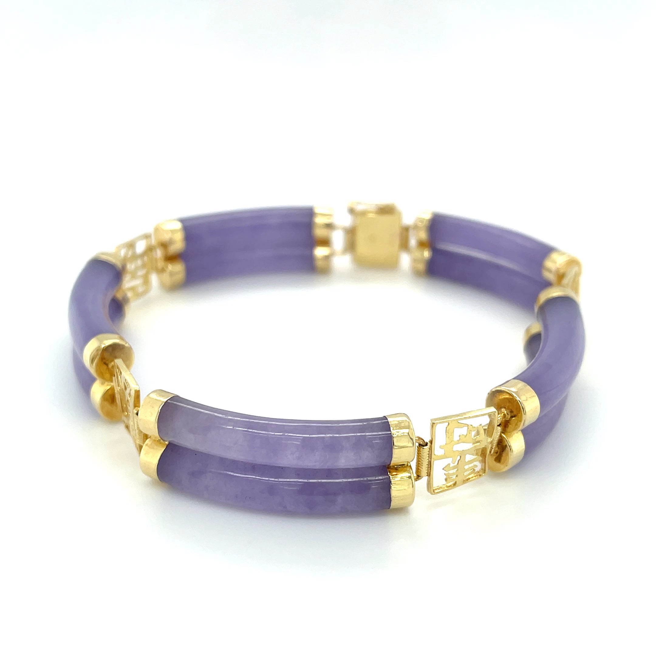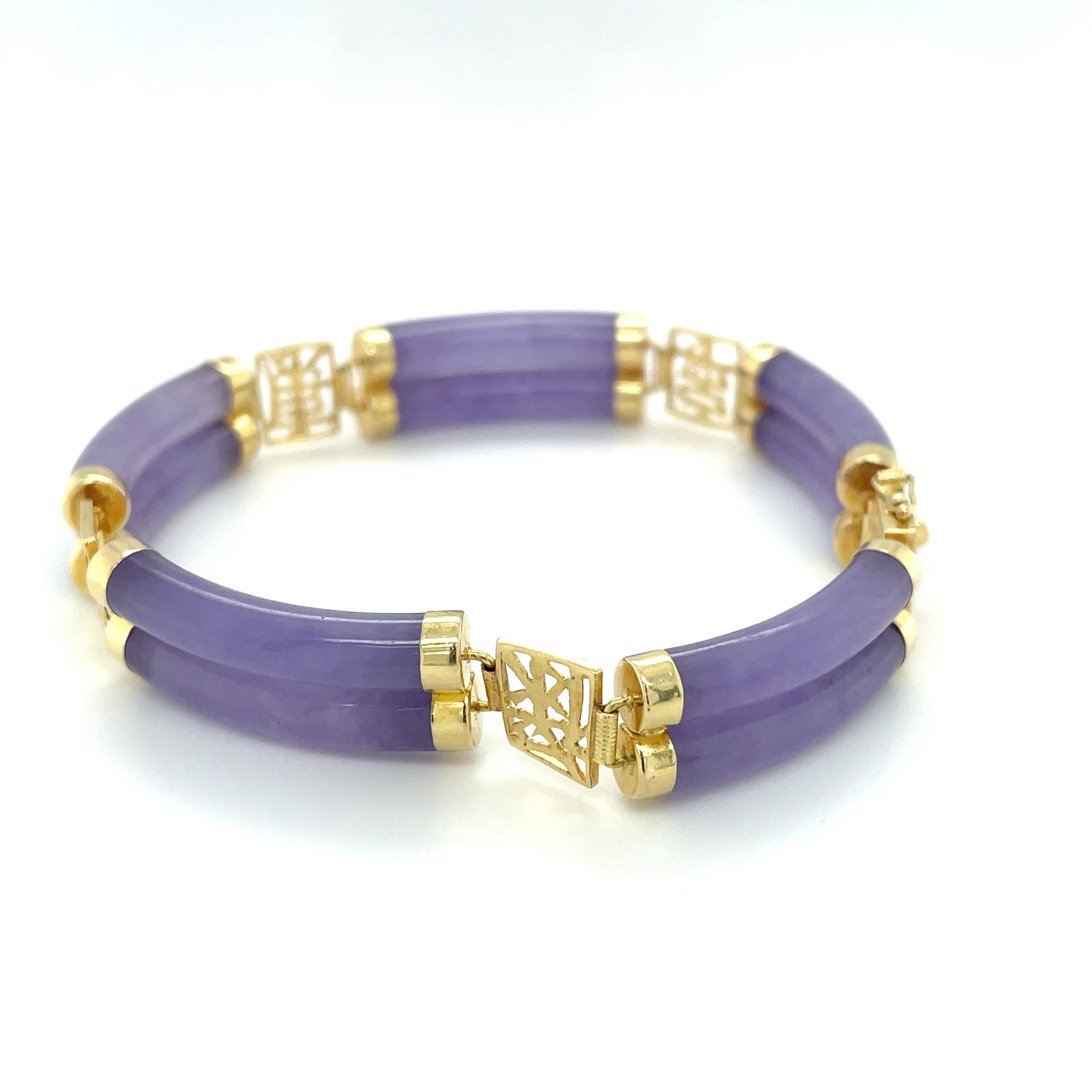 This beautiful bracelet is crafted from 14k yellow gold and features a stunning lavender jade design. The chain style adds a touch of elegance to this piece, making it perfect for any occasion. The bracelet is made with high-quality materials and is sure to last for years to come.