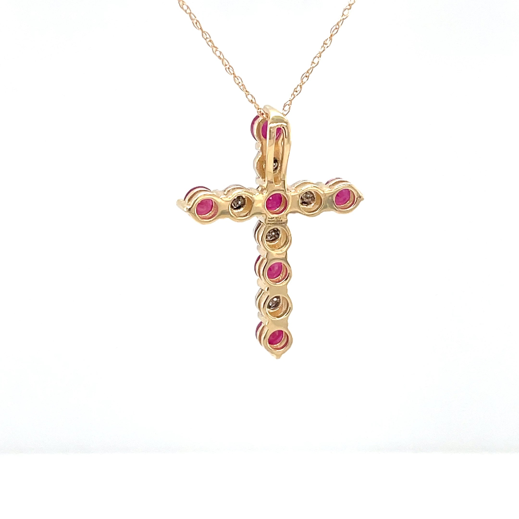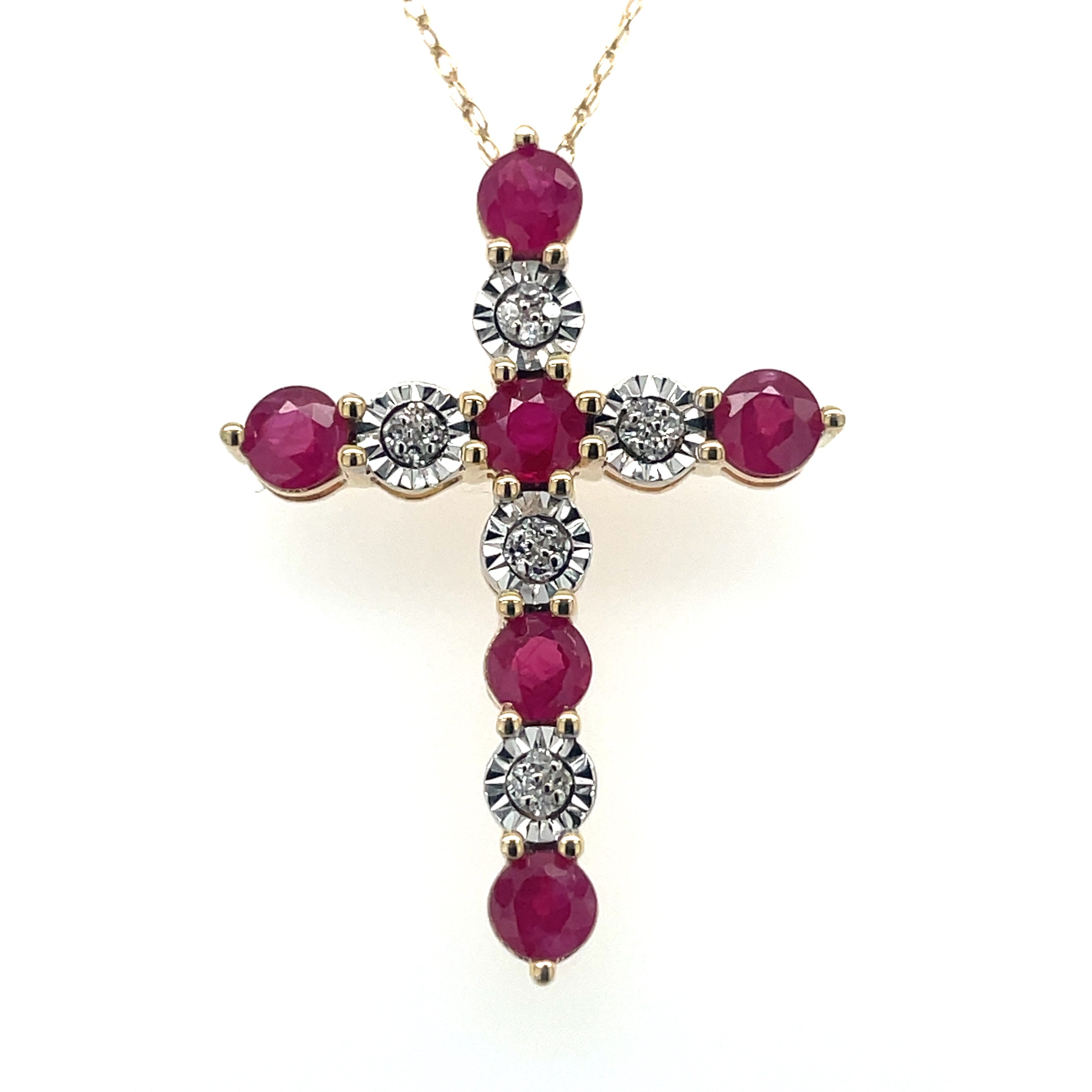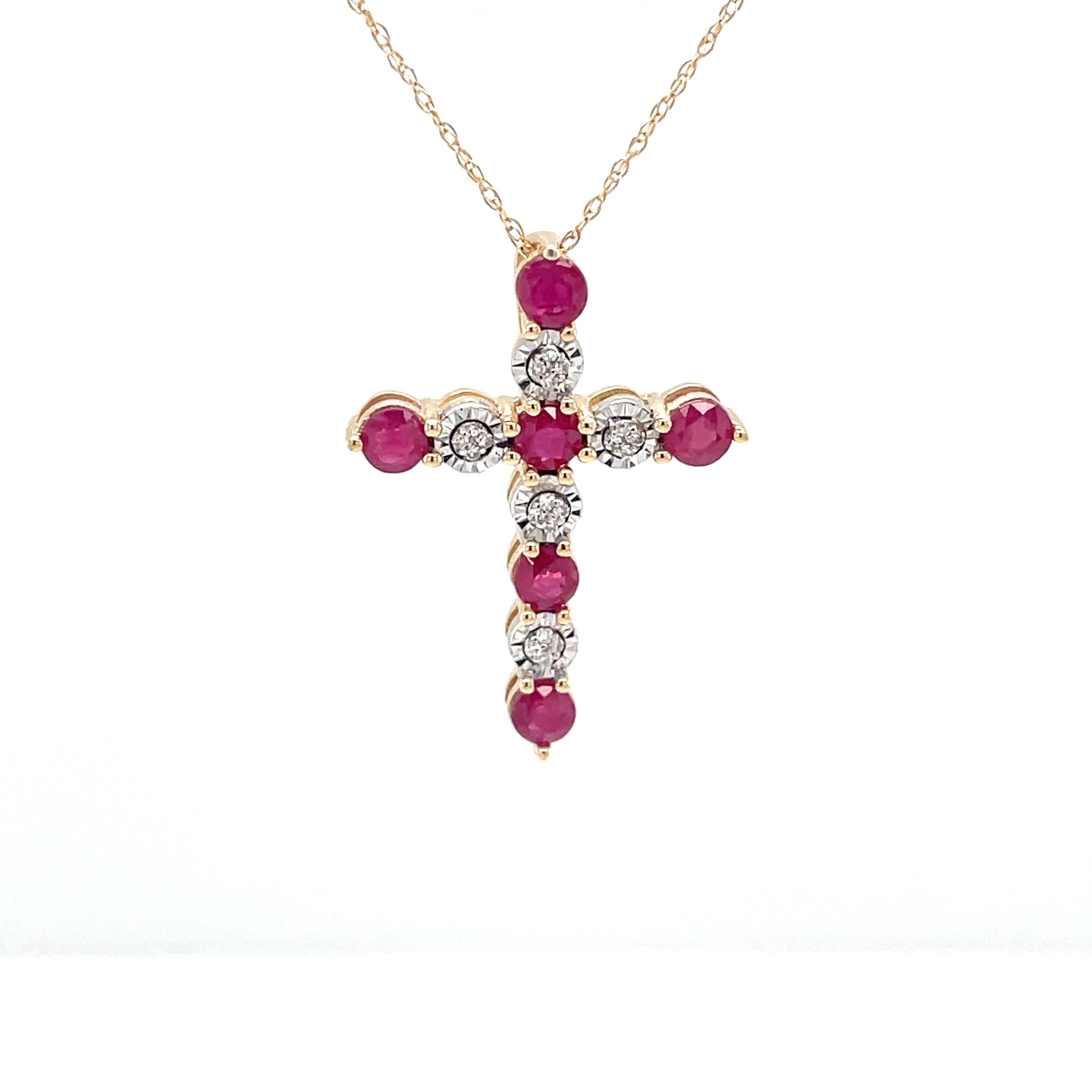 This exquisite necklace is a perfect addition to any jewelry collection. Crafted from 14k yellow gold, it features a stunning cross pendant with a beautiful red ruby and sparkling diamond accent. The pendant hangs from a delicate chain and would make a great statement piece for any occasion.