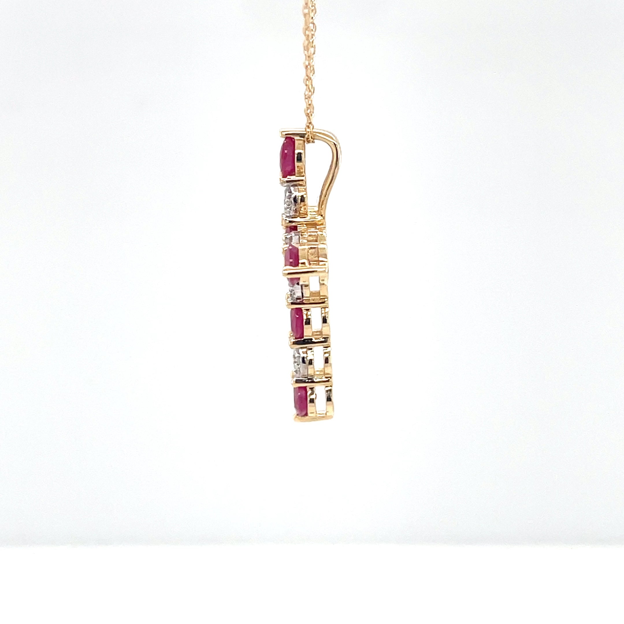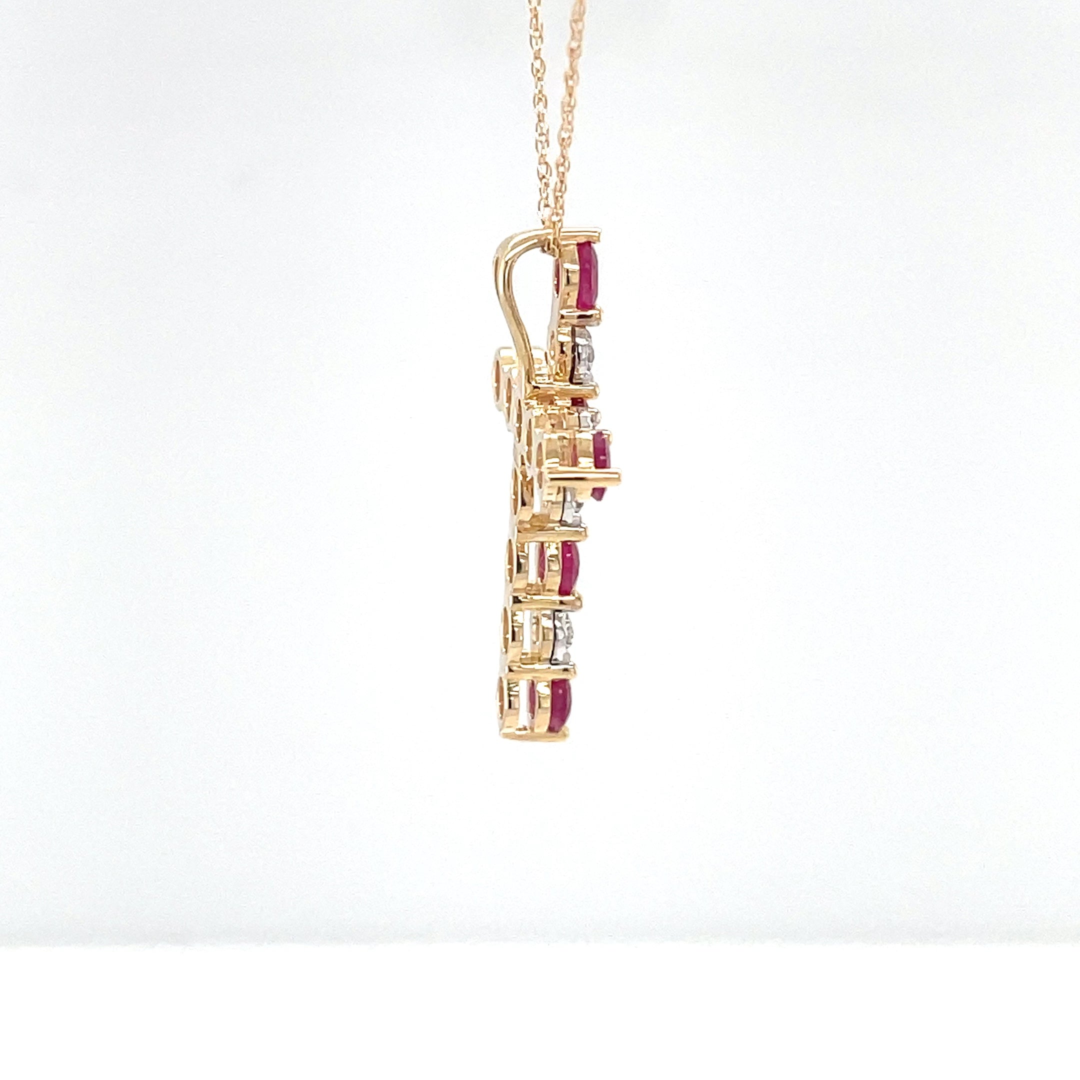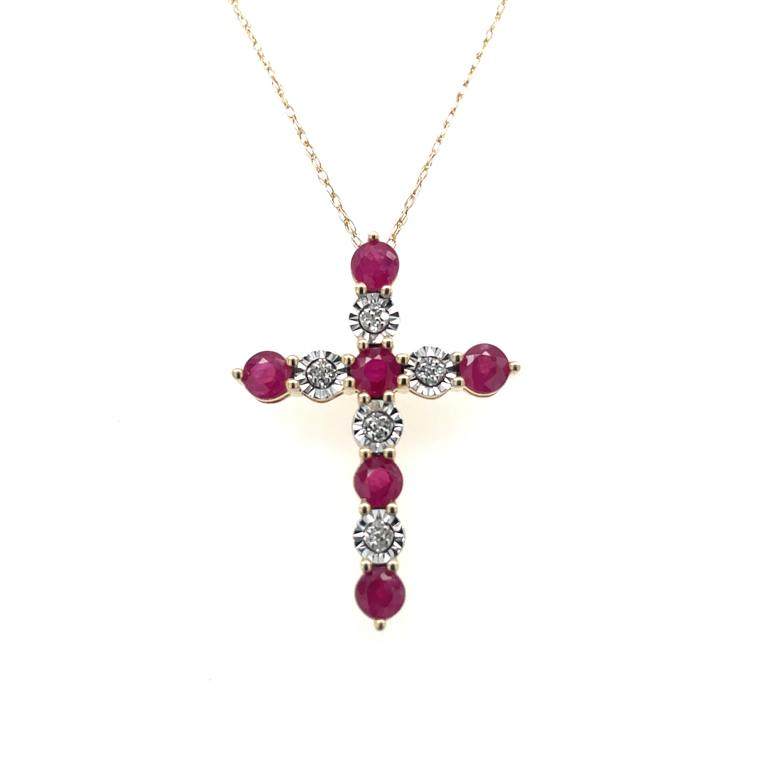 This exquisite necklace is a perfect addition to any jewelry collection. Crafted from 14k yellow gold, it features a stunning cross pendant with a beautiful red ruby and sparkling diamond accent. The pendant hangs from a delicate chain and would make a great statement piece for any occasion.