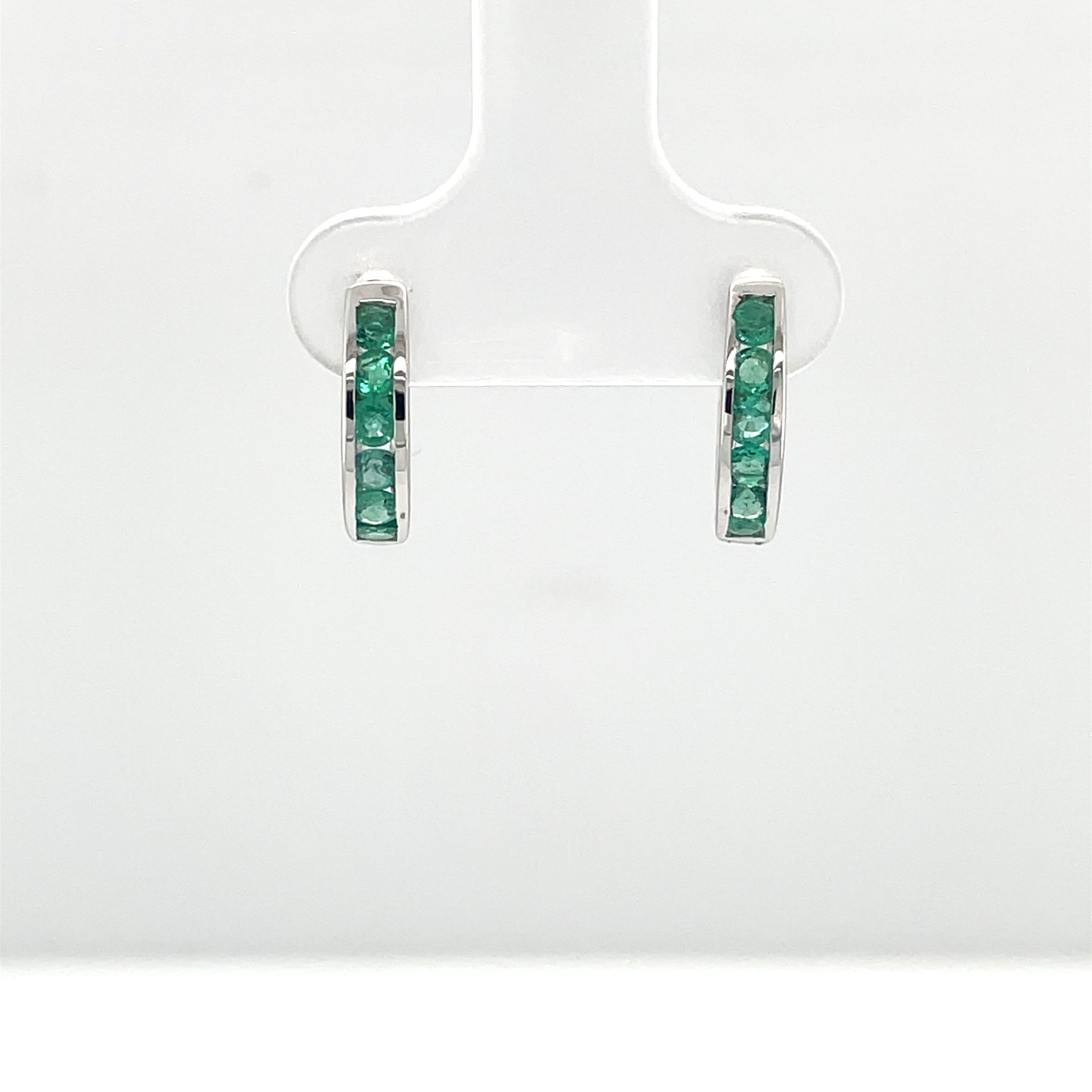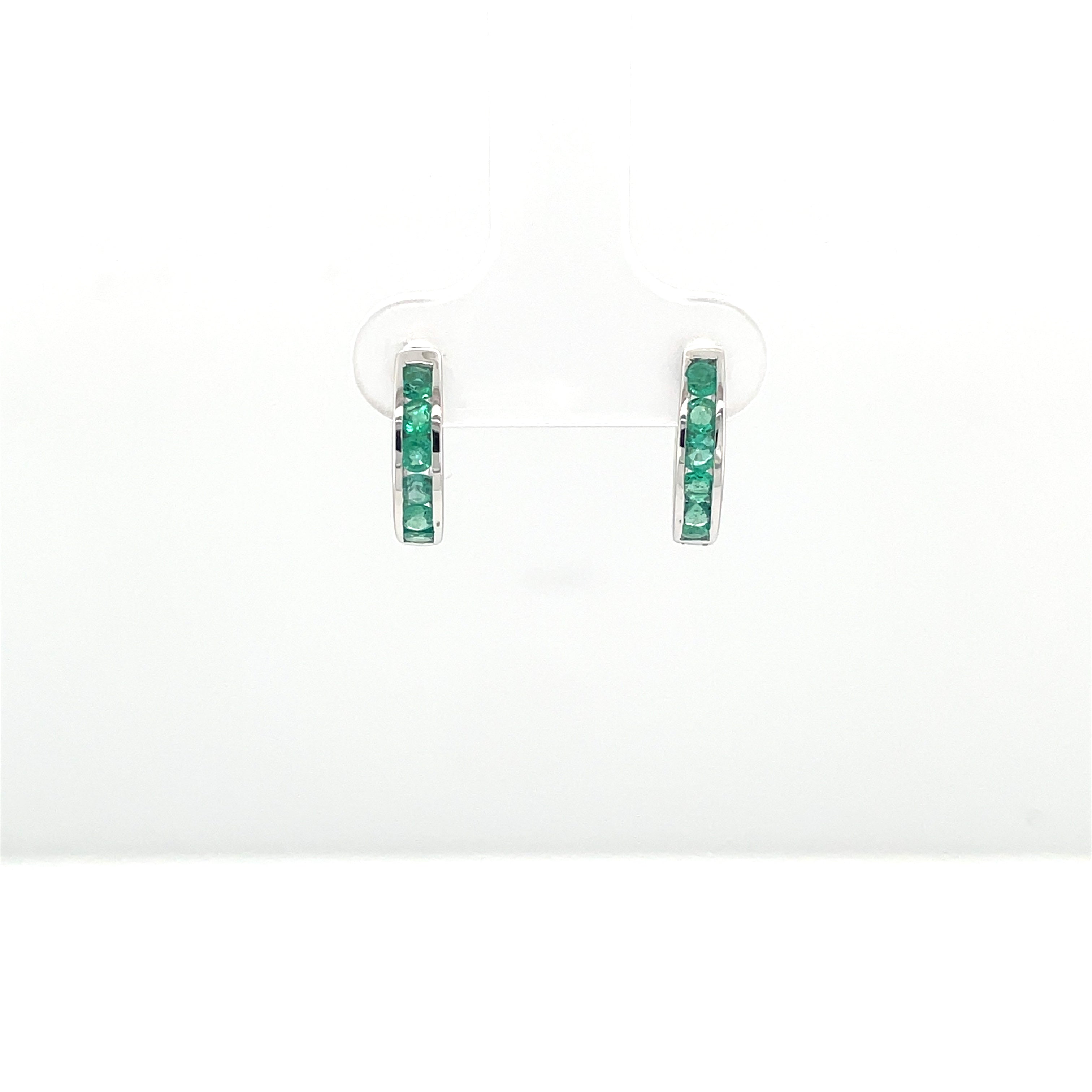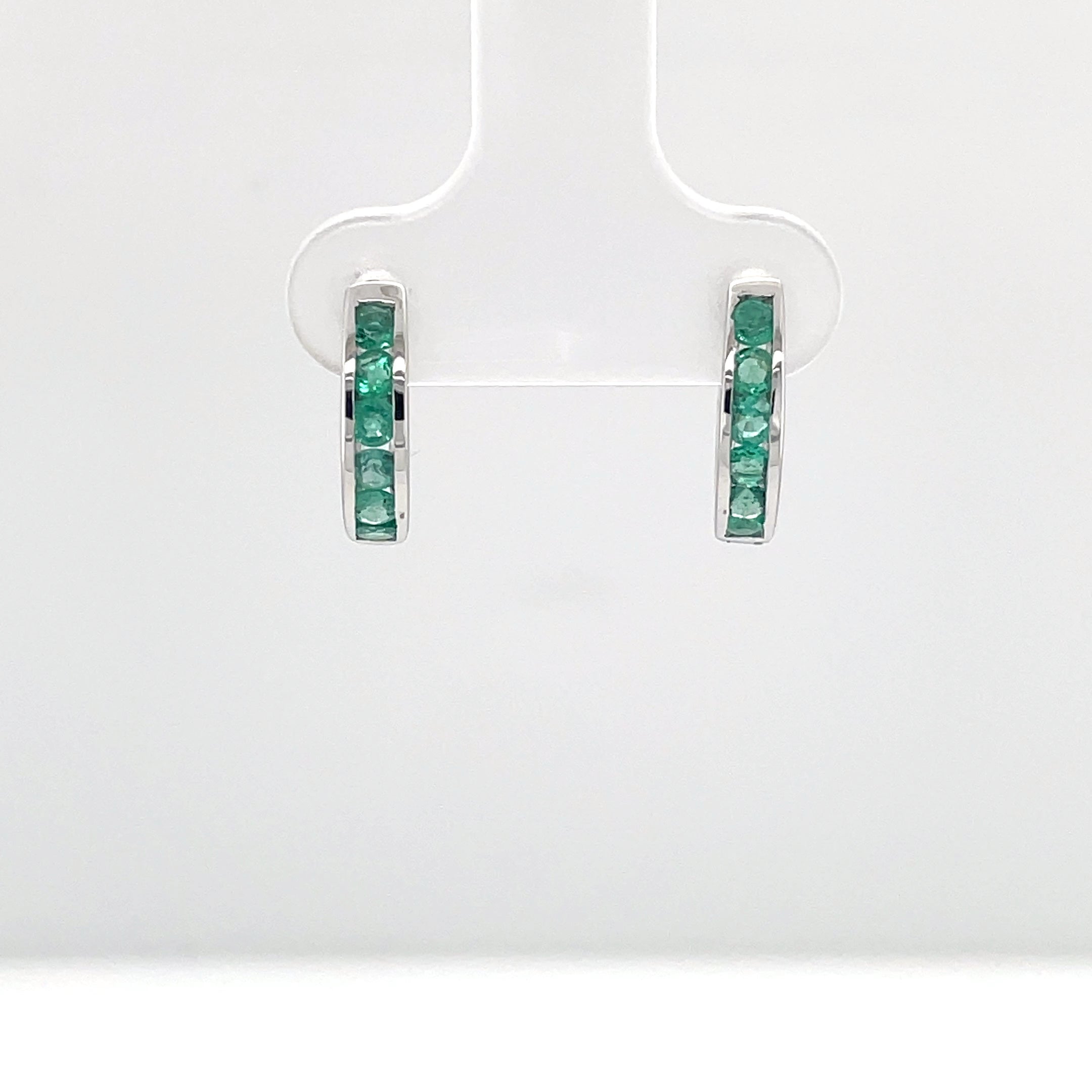 These 14K white gold huggie earrings are a perfect addition to any jewelry collection. The earrings feature a natural green emerald stone that adds a touch of elegance to any outfit. The round shape of the emerald stone and the white gold metal provide a classic and timeless look that will never go out of style.