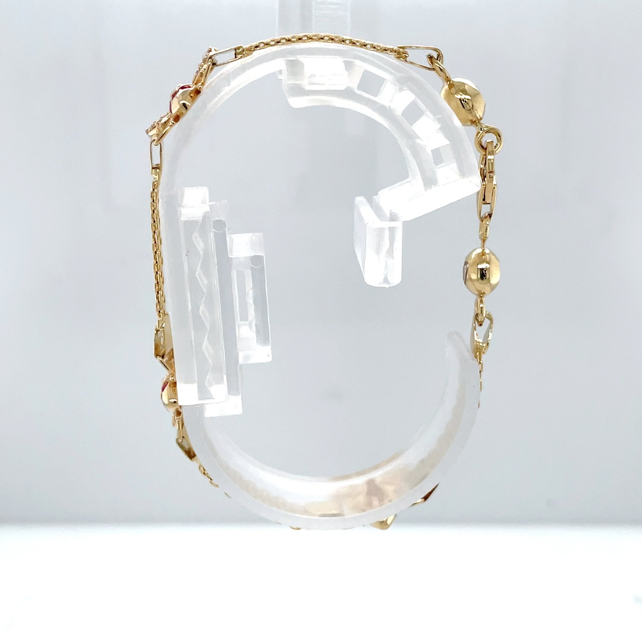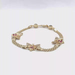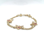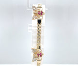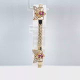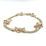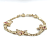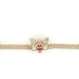 The bracelet is made of high-quality materials, including simulated cubic zirconia stones and ruby secondary stones. It is perfect for everyday wear or special occasions, and the yellow gold color adds a touch of luxury to any outfit. This bracelet is a must-have for any jewelry collection and is sure to impress.