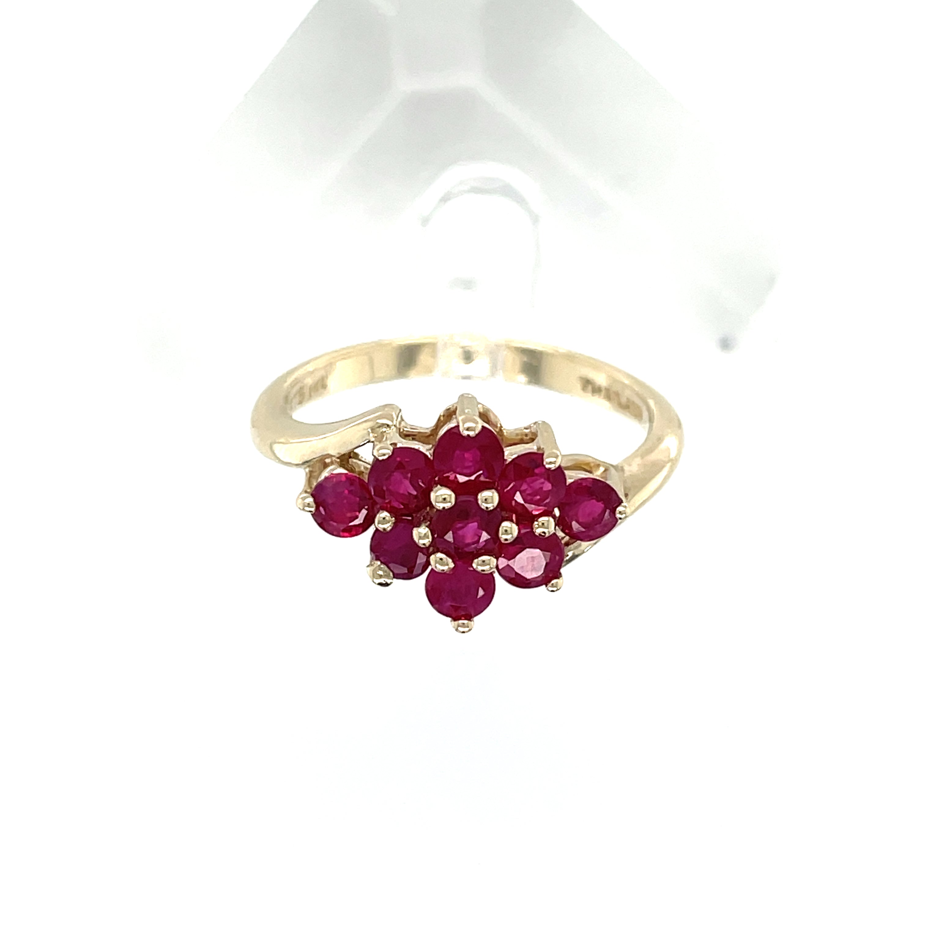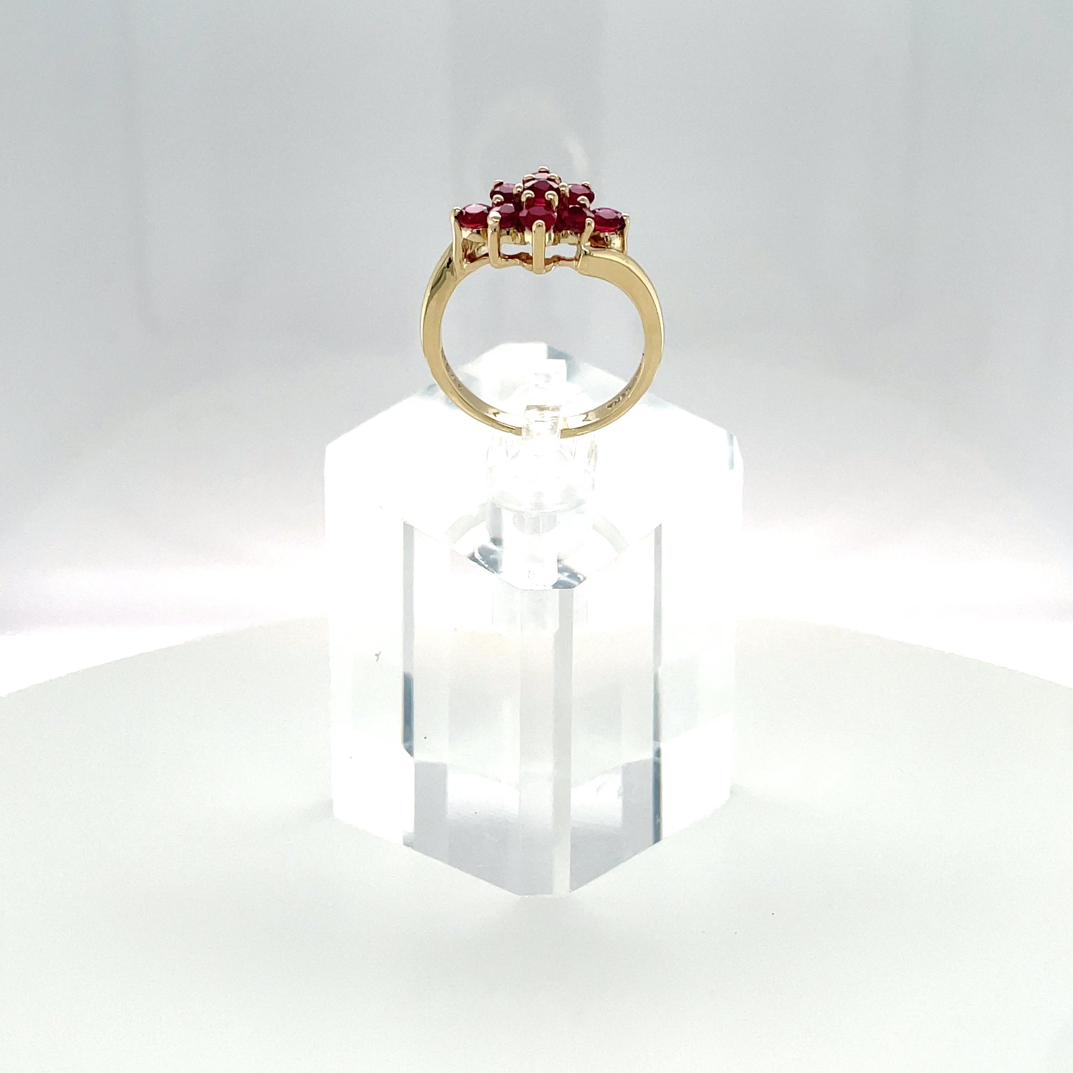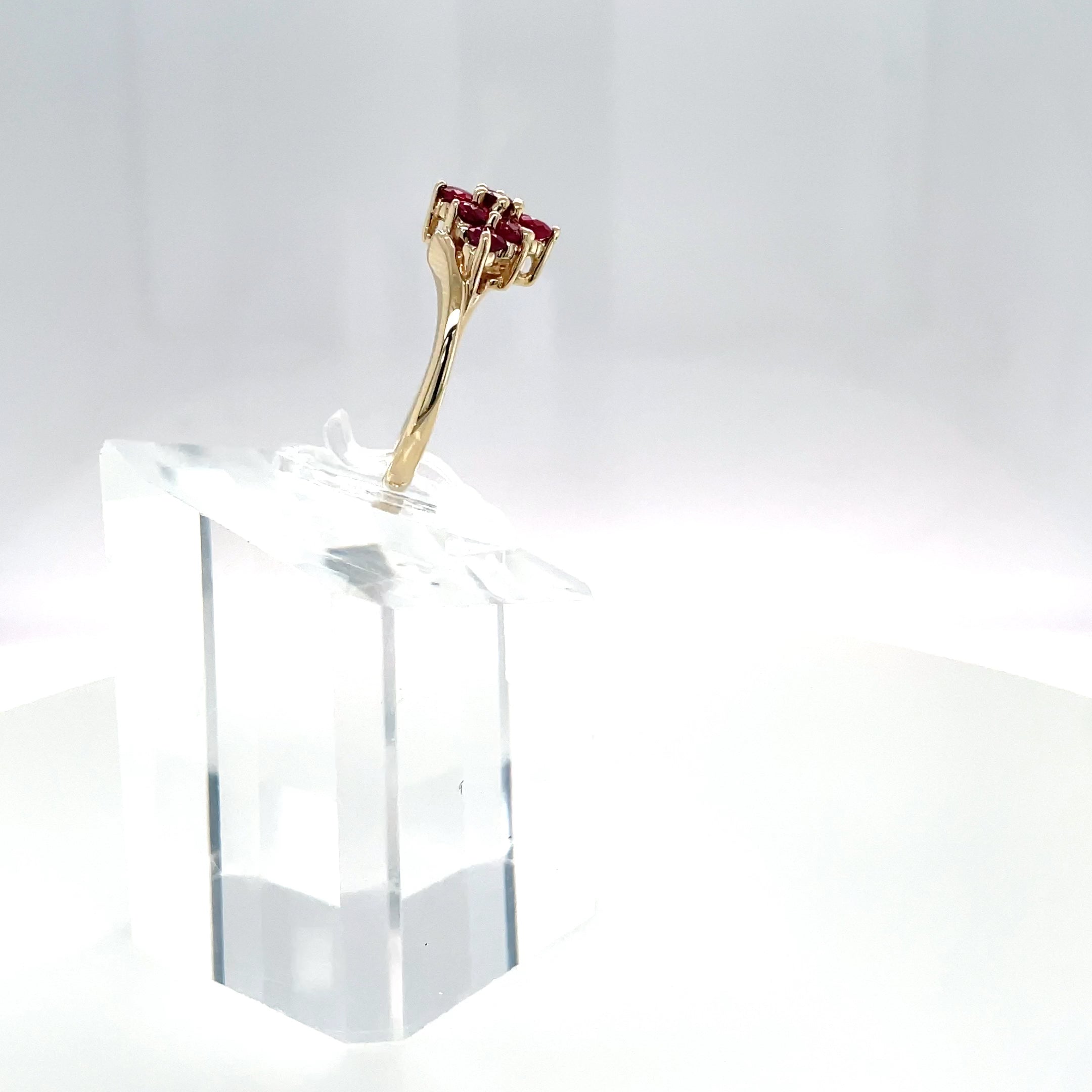 This stunning 14K yellow gold ring features a beautiful cluster setting with natural ruby stones. The ring is size 7 and can be resized if needed. The red color of the ruby stones pairs well with the yellow gold, making it a great addition to any jewelry collection.