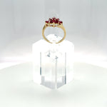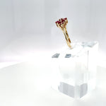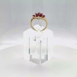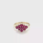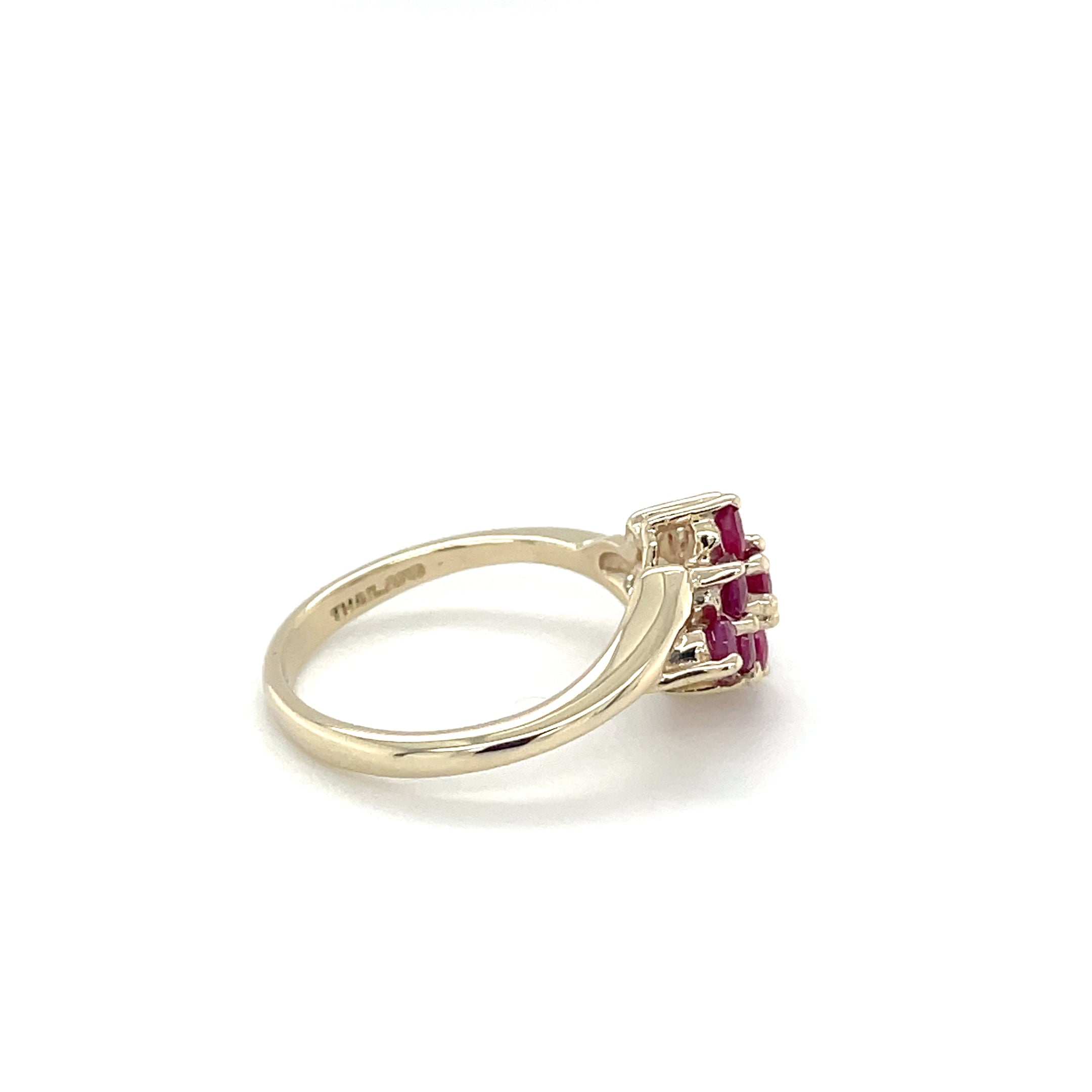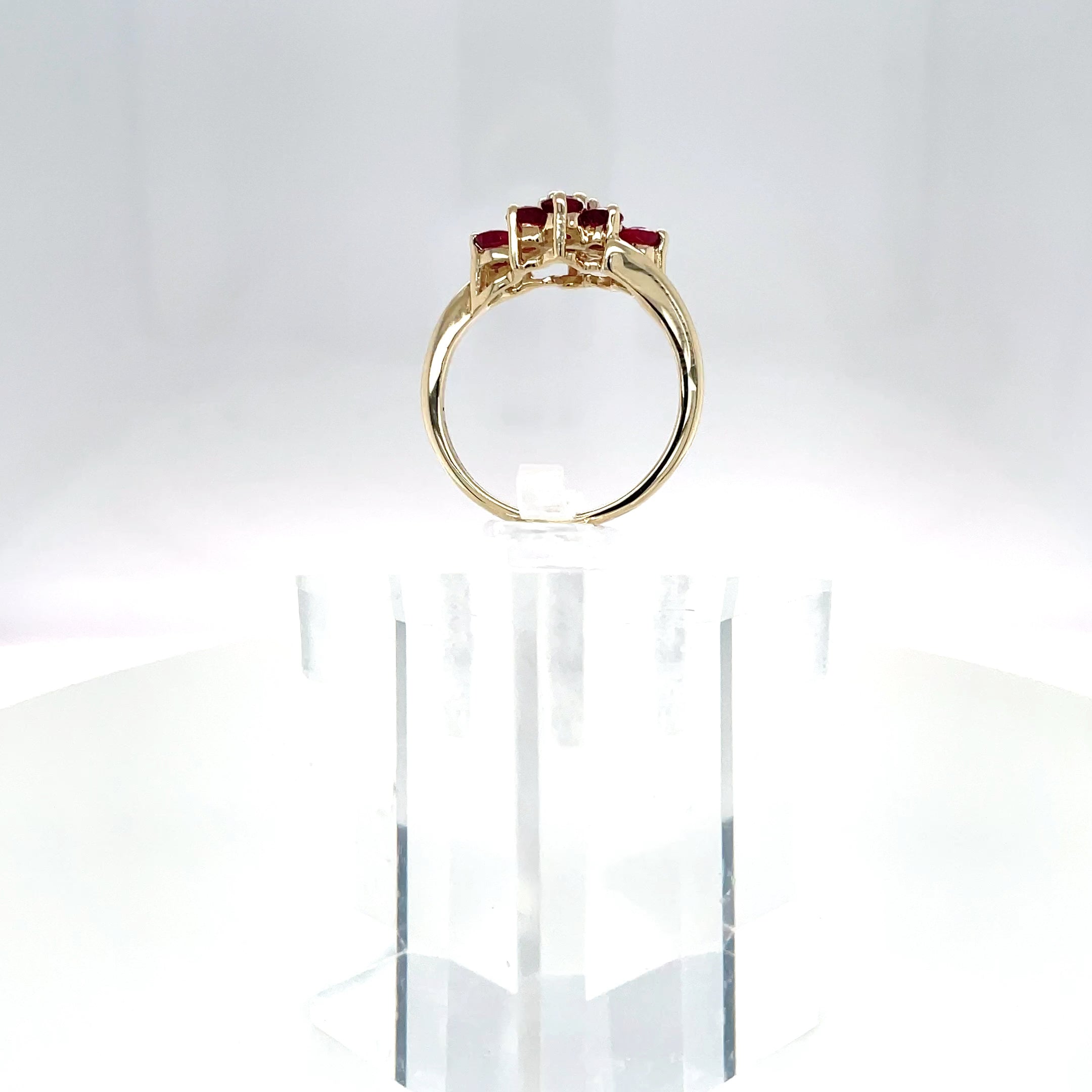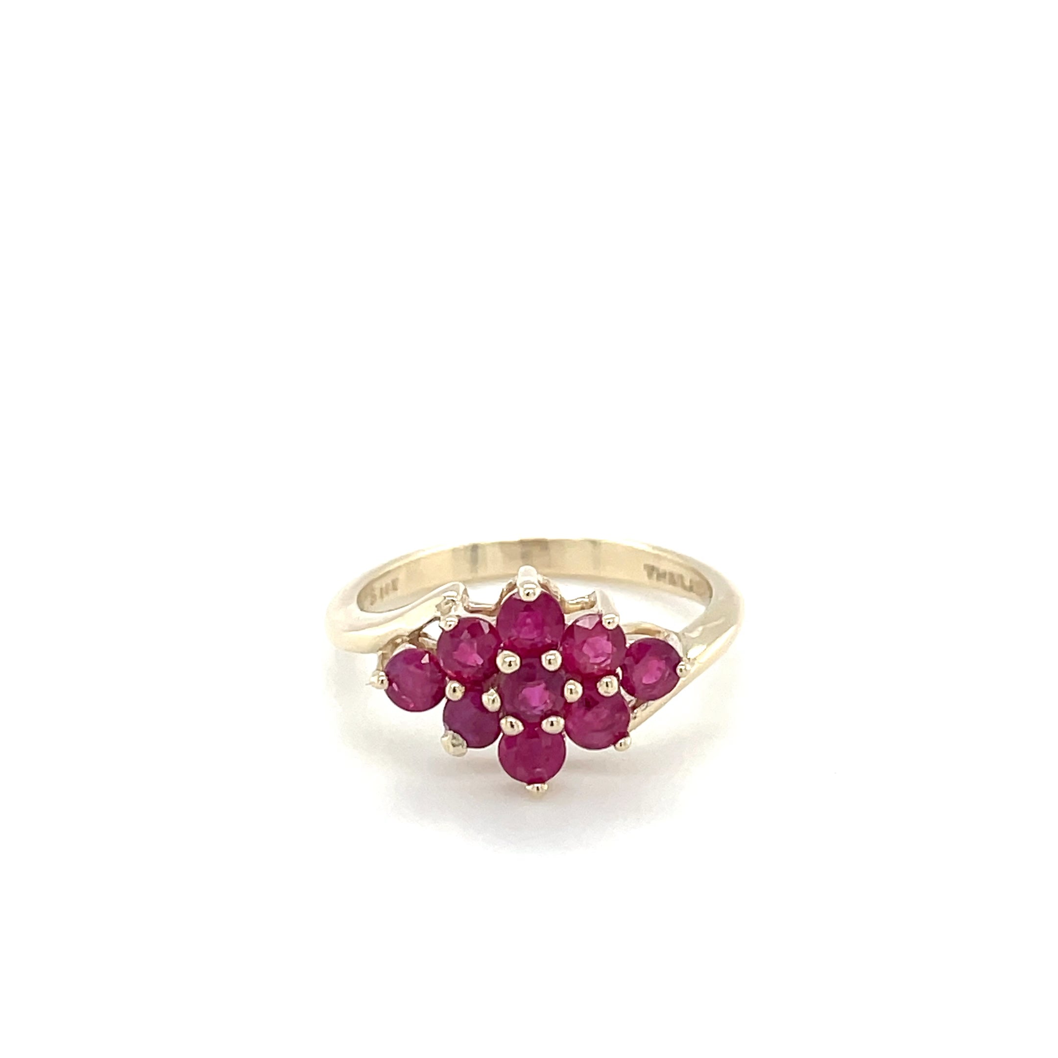 This stunning 14K yellow gold ring features a beautiful cluster setting with natural ruby stones. The ring is size 7 and can be resized if needed. The red color of the ruby stones pairs well with the yellow gold, making it a great addition to any jewelry collection.