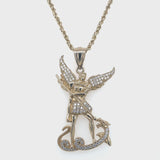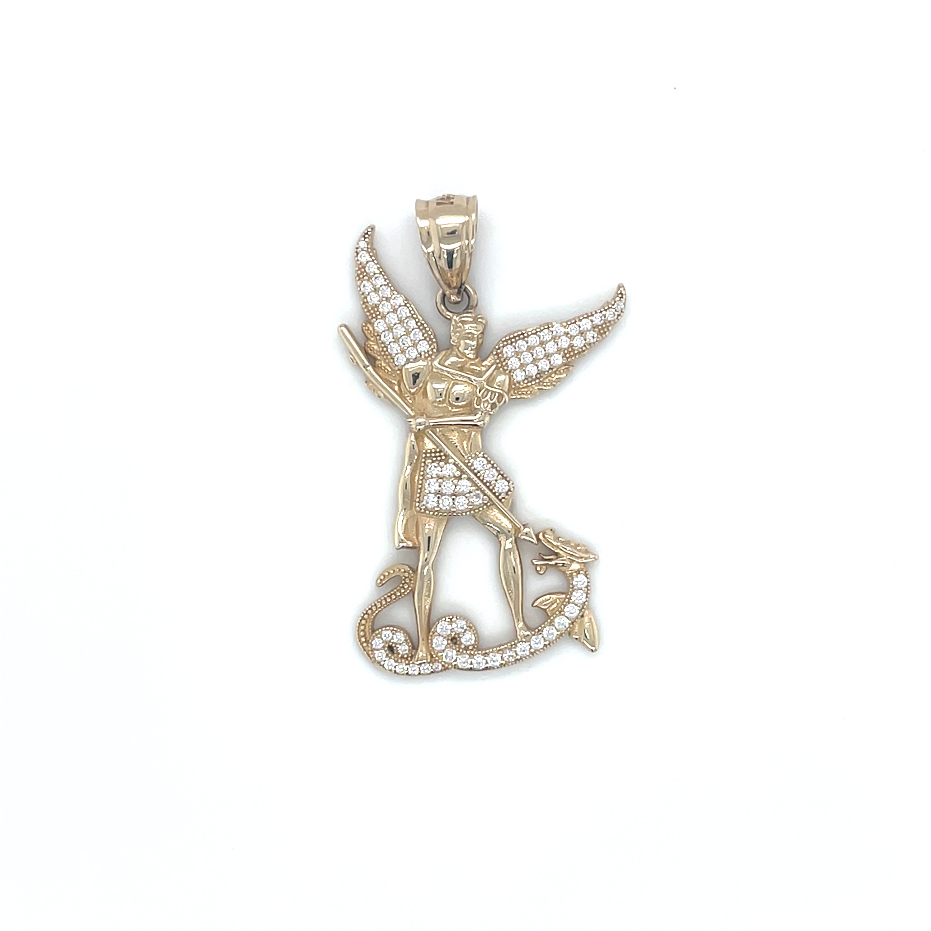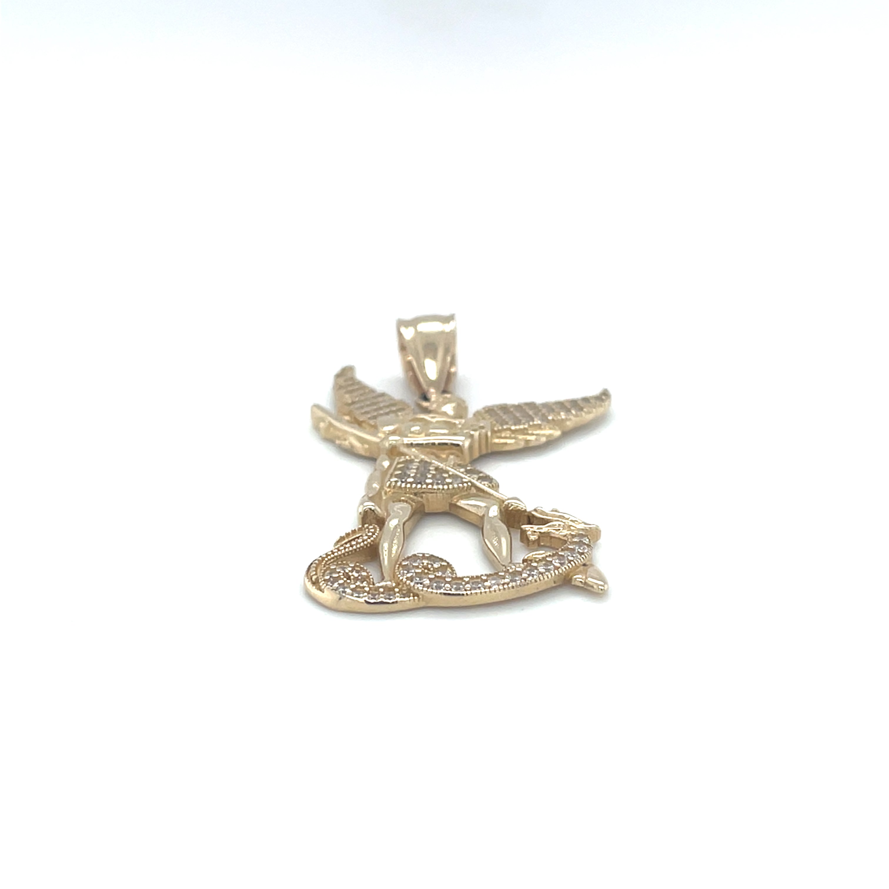 This 14K Yellow Gold Saint Michael Pendant features a religious theme with a St. Michael shape, making it a significant piece for individuals of both men and women. Crafted from high-quality yellow gold, this pendant showcases round Cubic Zirconia stones as the main focal point. The design exudes a sense of elegance and faith, making it a meaningful addition to any jewelry collection.
