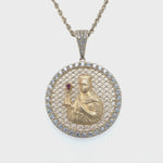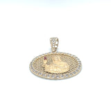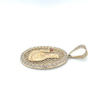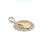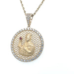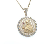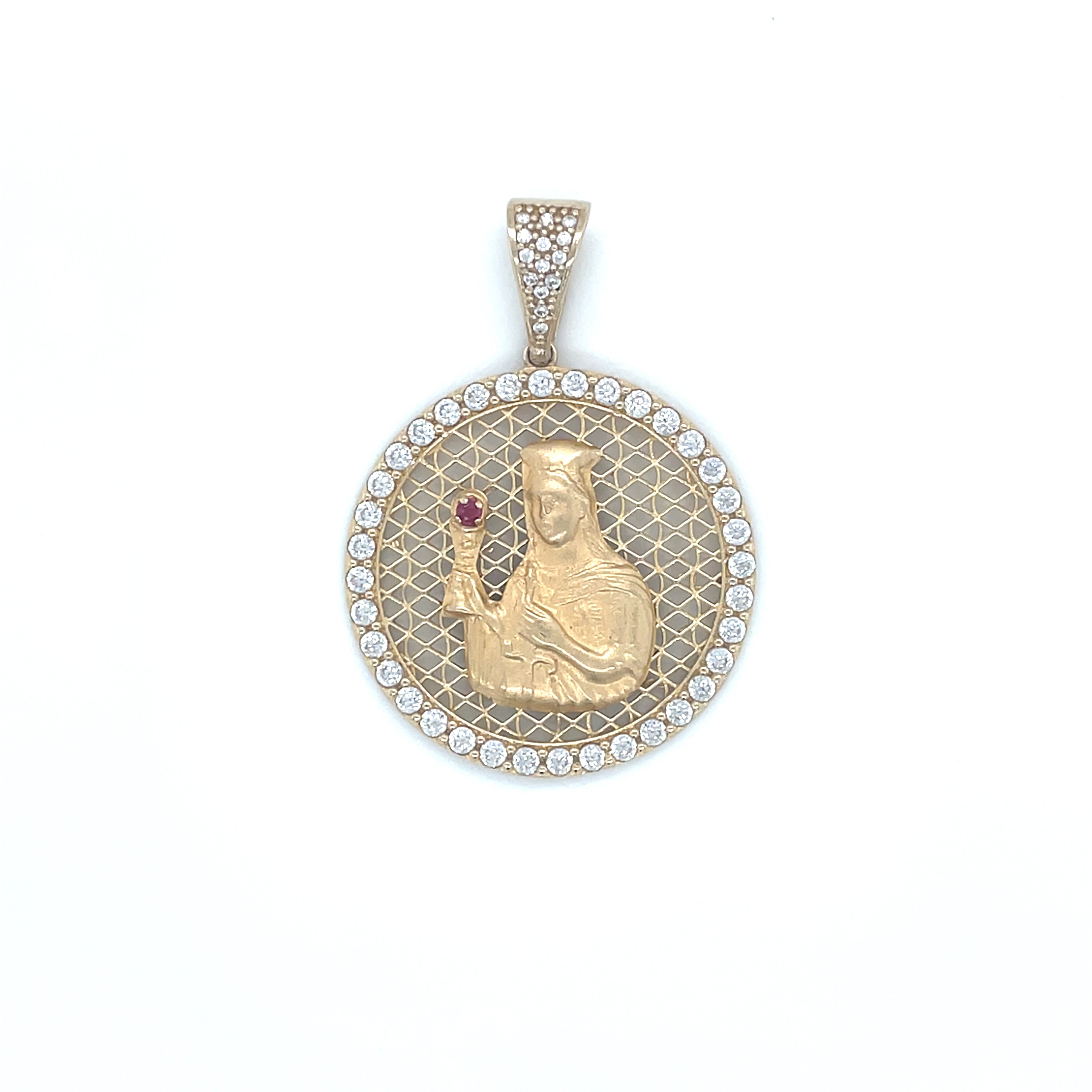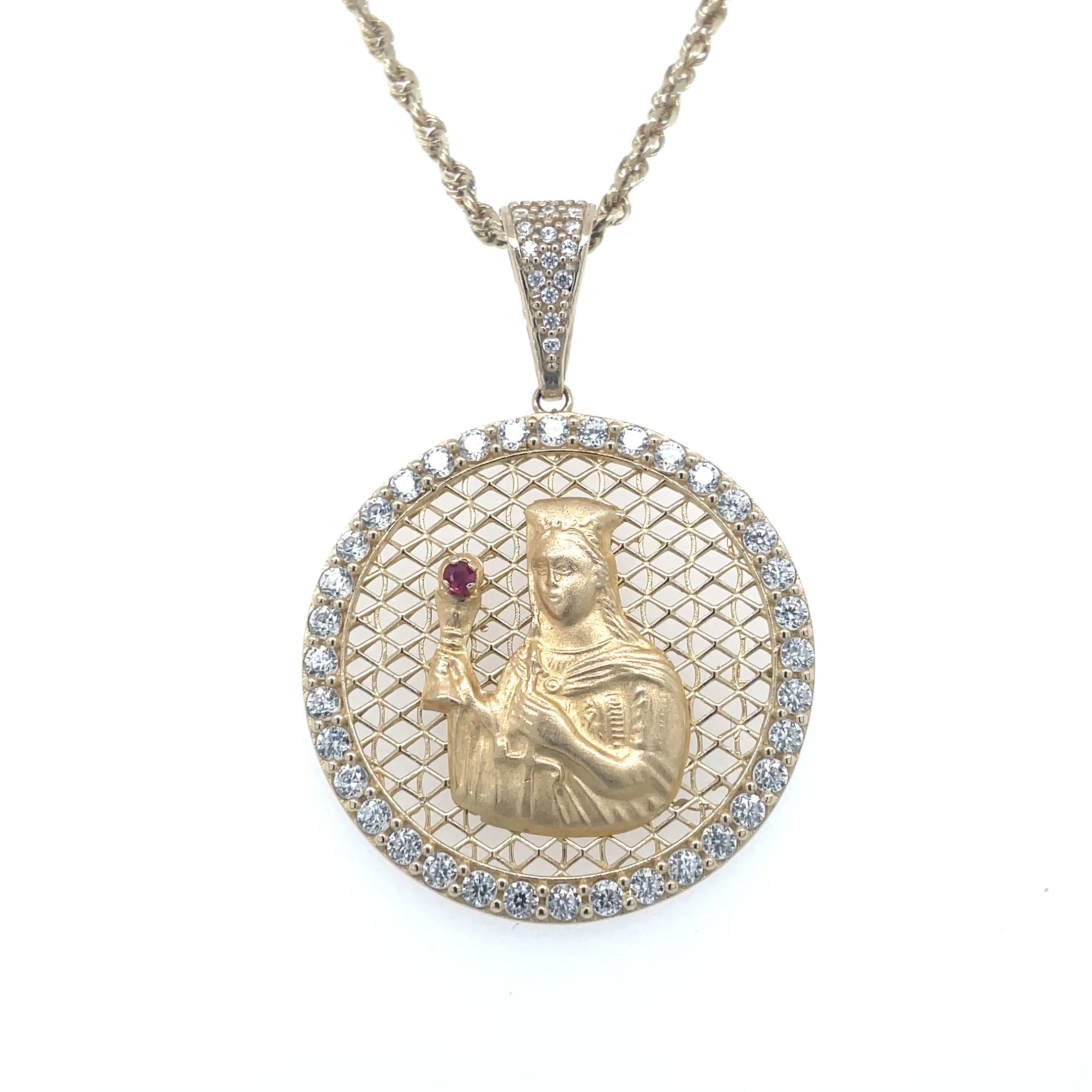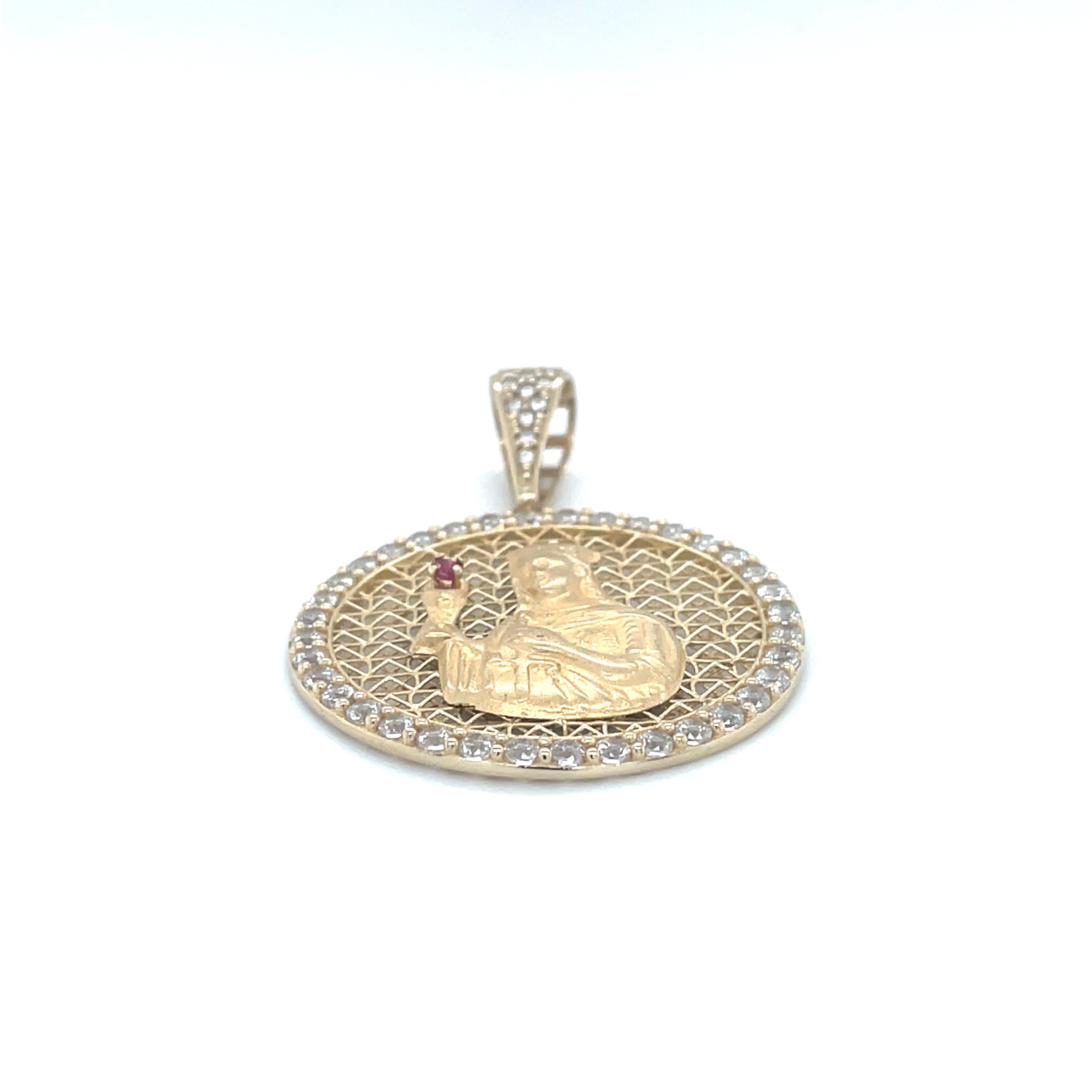 The 14K Yellow Gold Santa Barbara Pendant features a round pendant design. Crafted from yellow gold, this unisex pendant showcases a religious theme with a main stone and secondary stone both made of Cubic Zirconia. The pendant is designed with a 14k gold metal purity and is perfect for those who appreciate unique ethnic and regional jewelry styles.