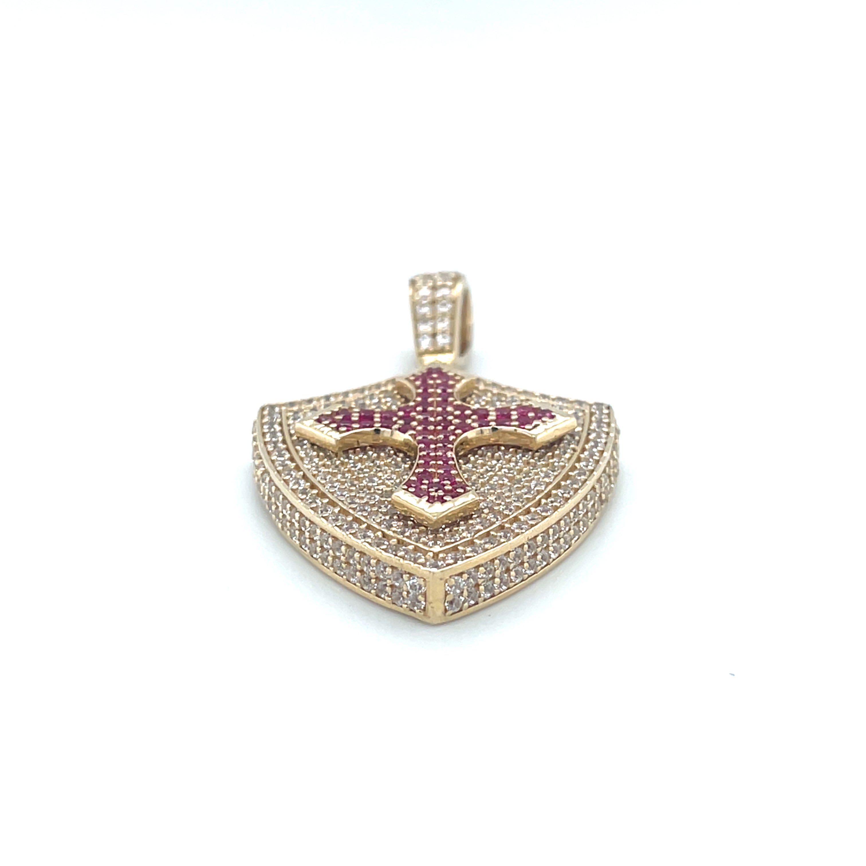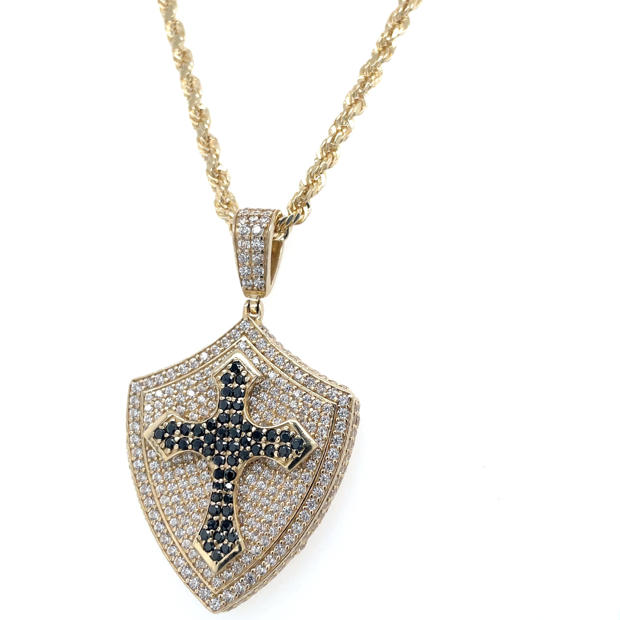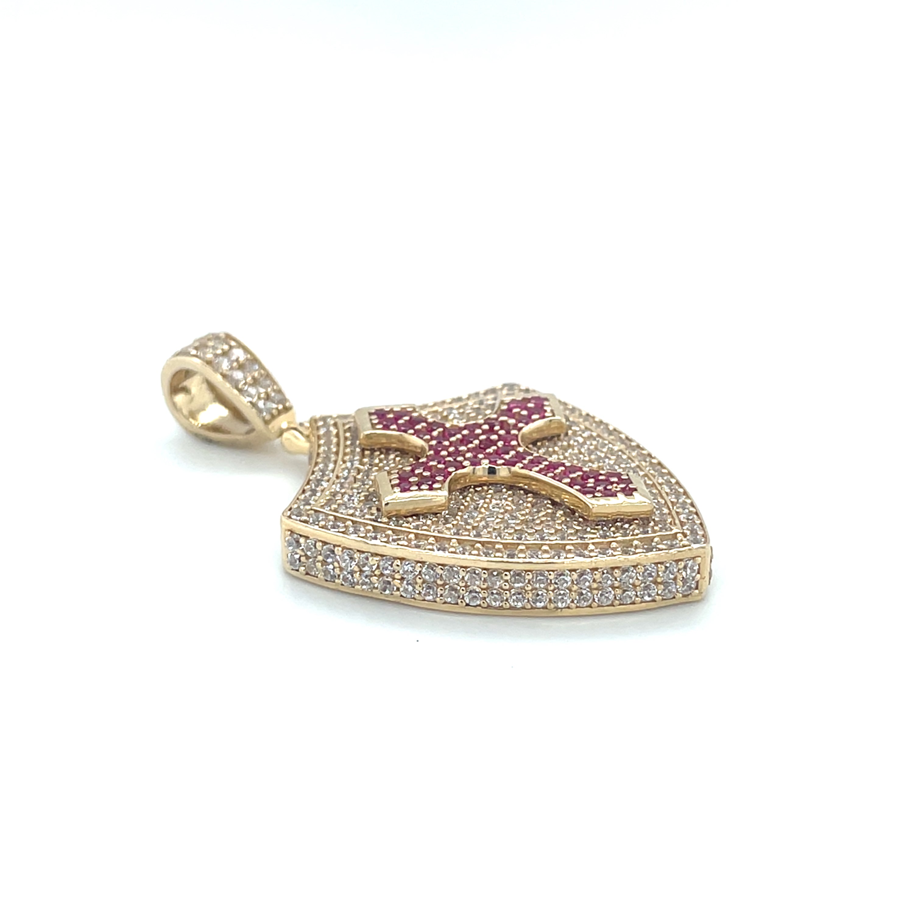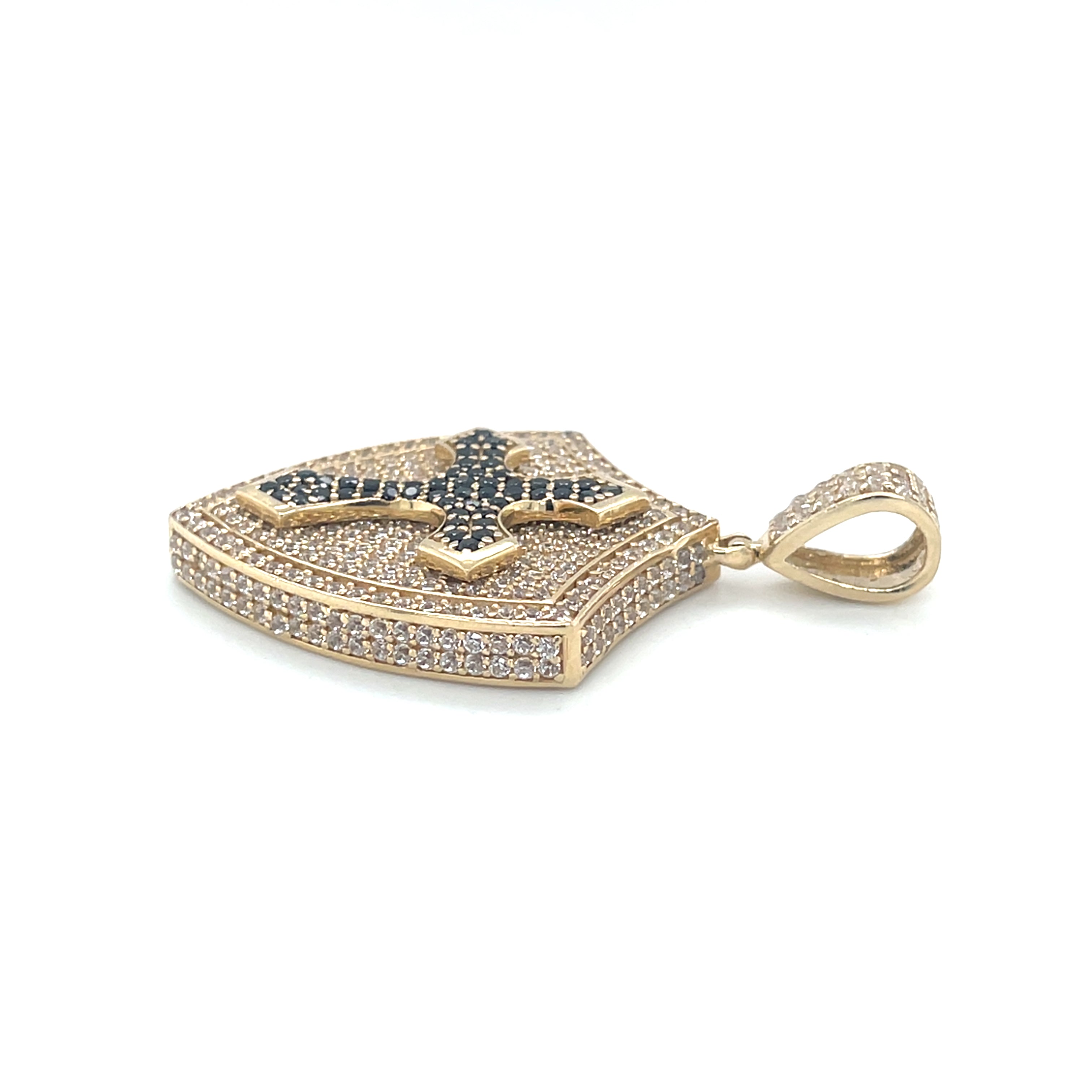 The 14K Yellow Gold Shield Cross Pendant features black/red Cubic Zirconia stones set in a shield-shaped design. The pendant is crafted in yellow gold and adorned with a religious cross motif, making it a meaningful and stylish piece of men's jewelry. The combination of the shield shape, black/red stones, and cross design adds a touch of sophistication and spiritual significance to this pendant.