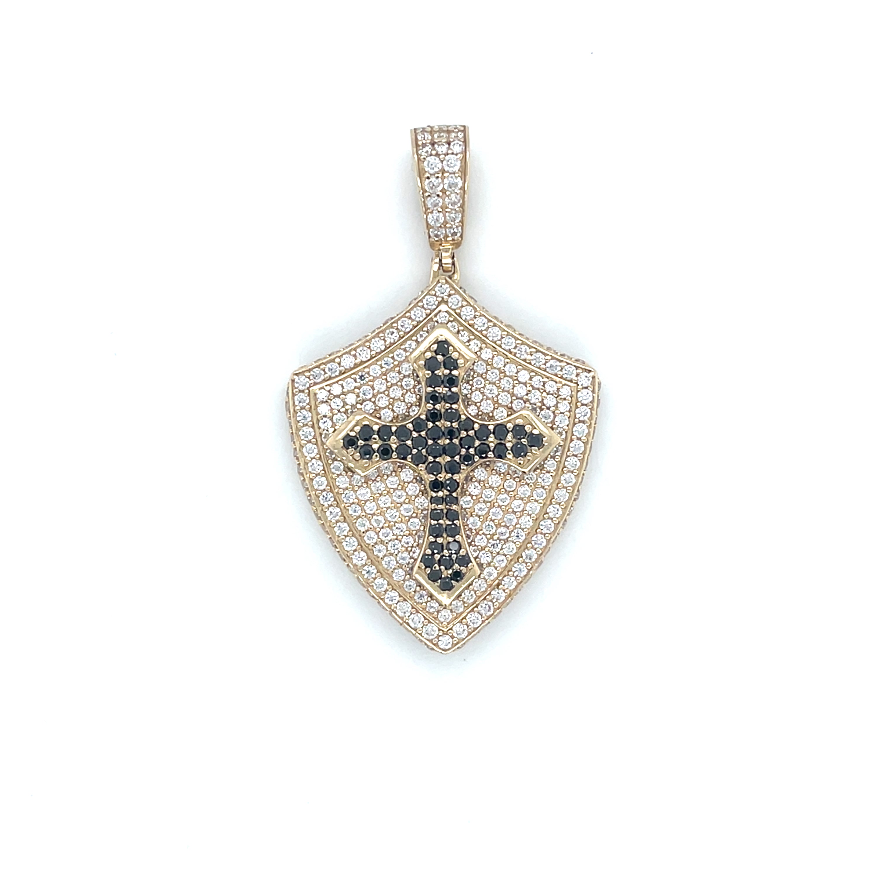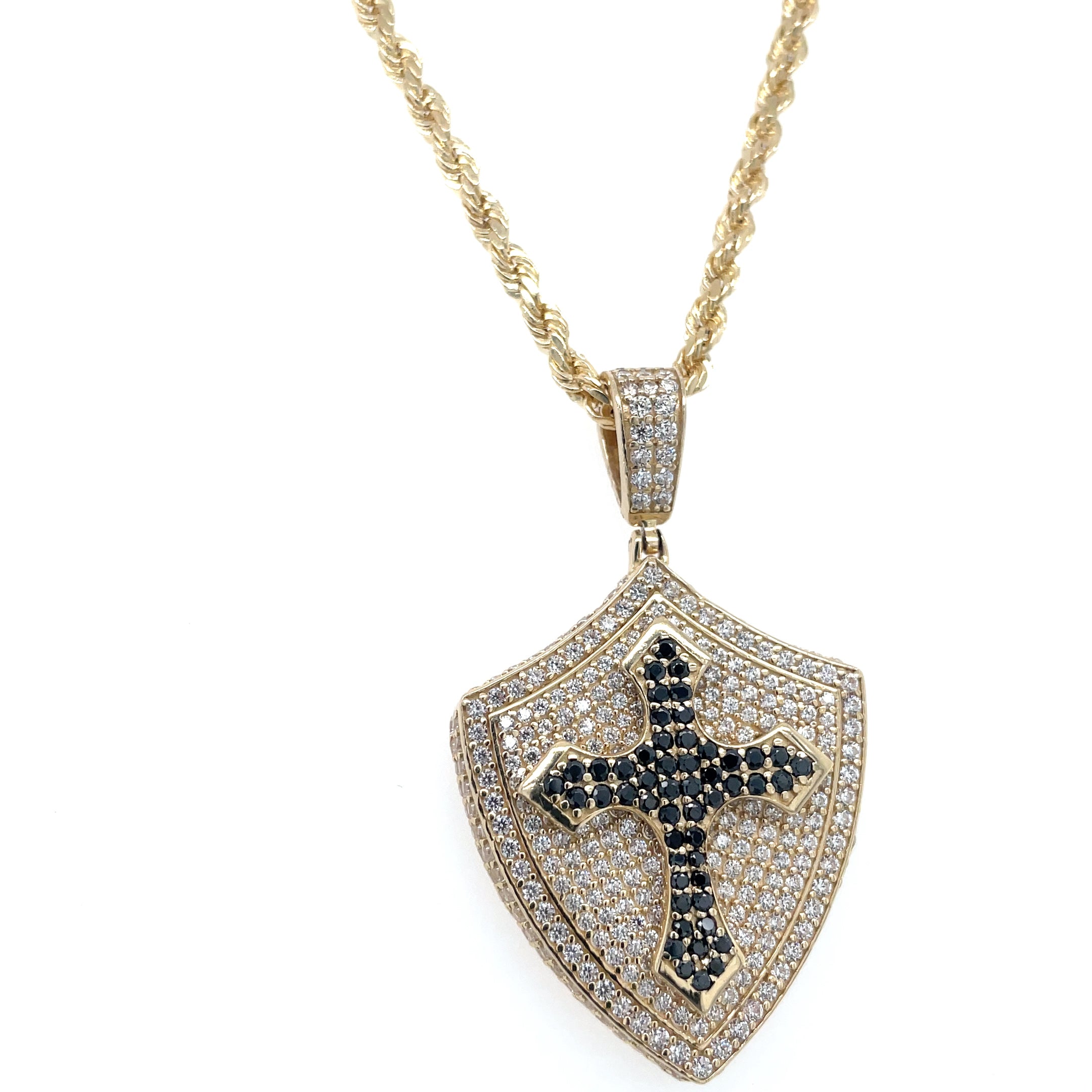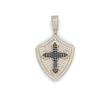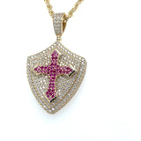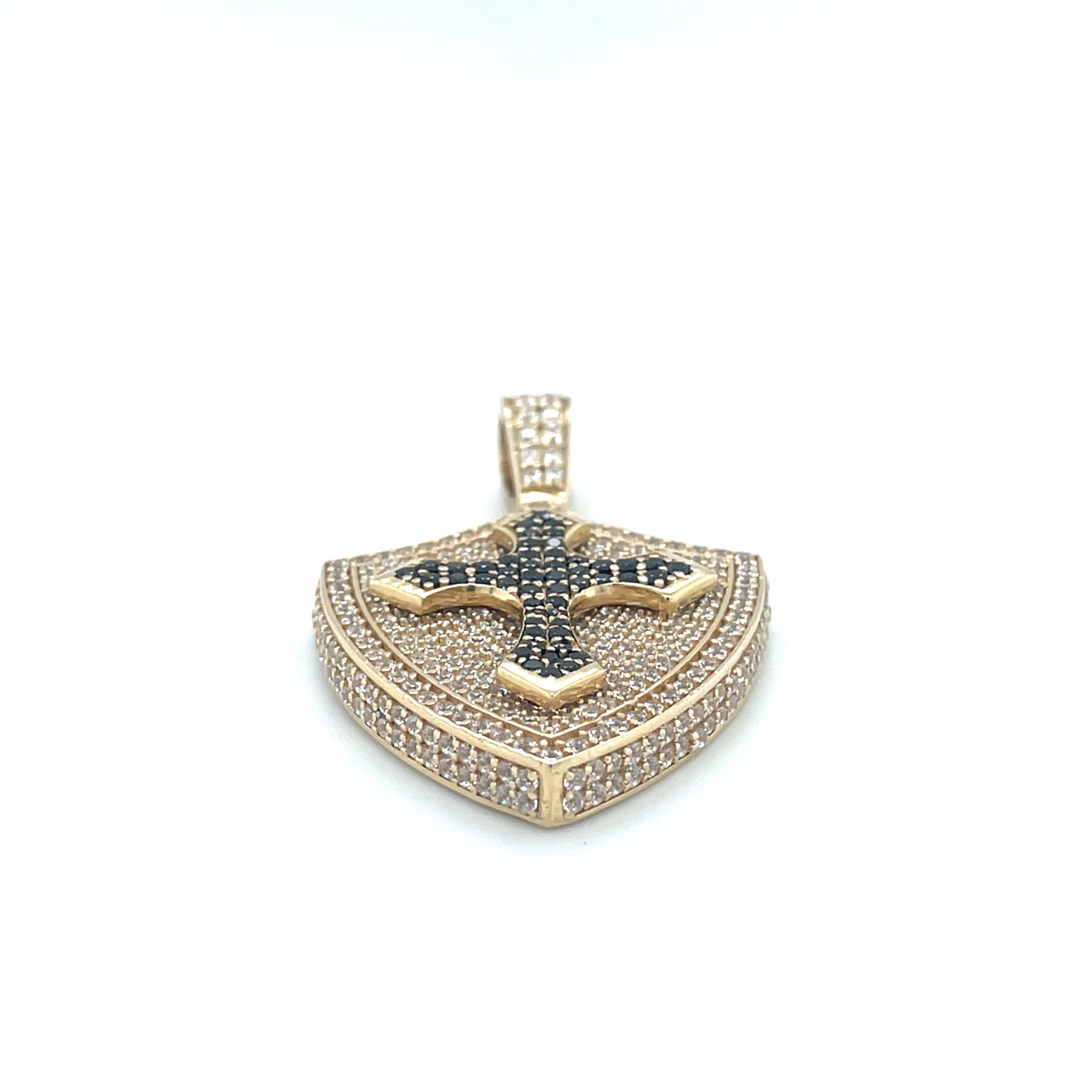 The 14K Yellow Gold Shield Cross Pendant features black/red Cubic Zirconia stones set in a shield-shaped design. The pendant is crafted in yellow gold and adorned with a religious cross motif, making it a meaningful and stylish piece of men's jewelry. The combination of the shield shape, black/red stones, and cross design adds a touch of sophistication and spiritual significance to this pendant.