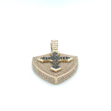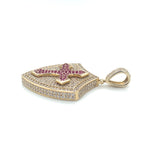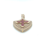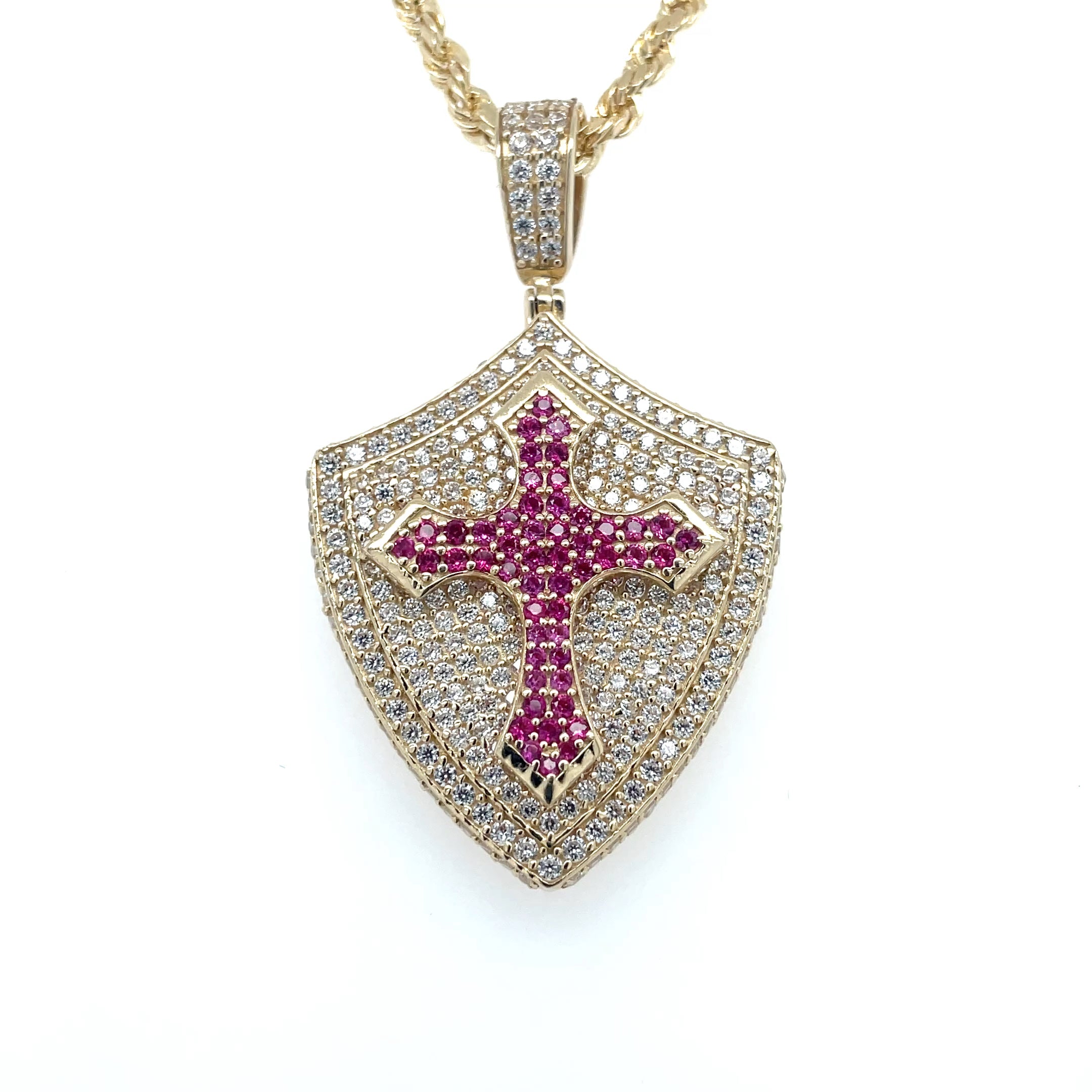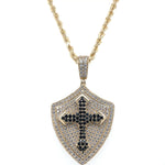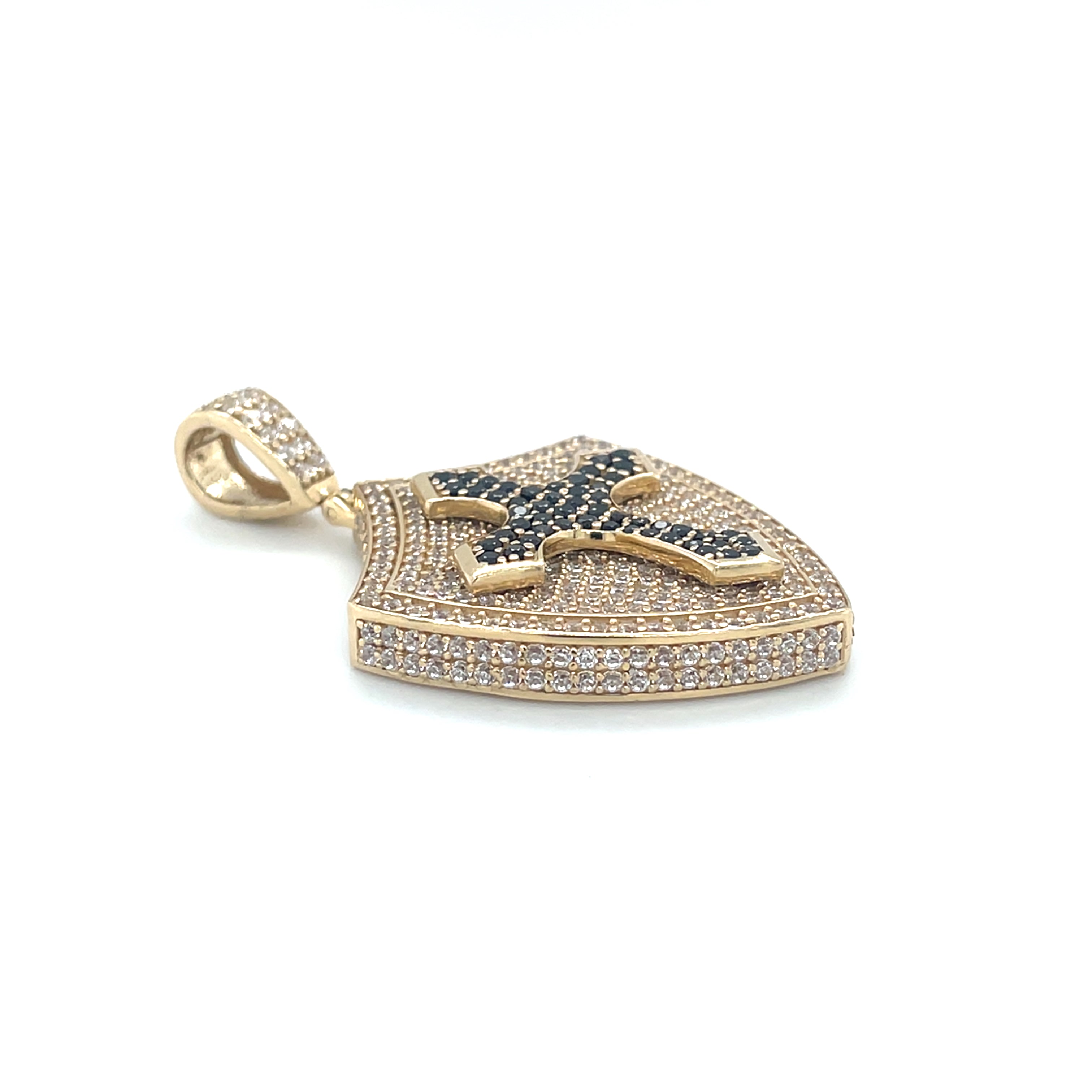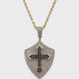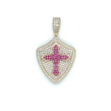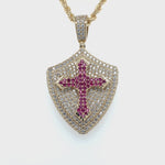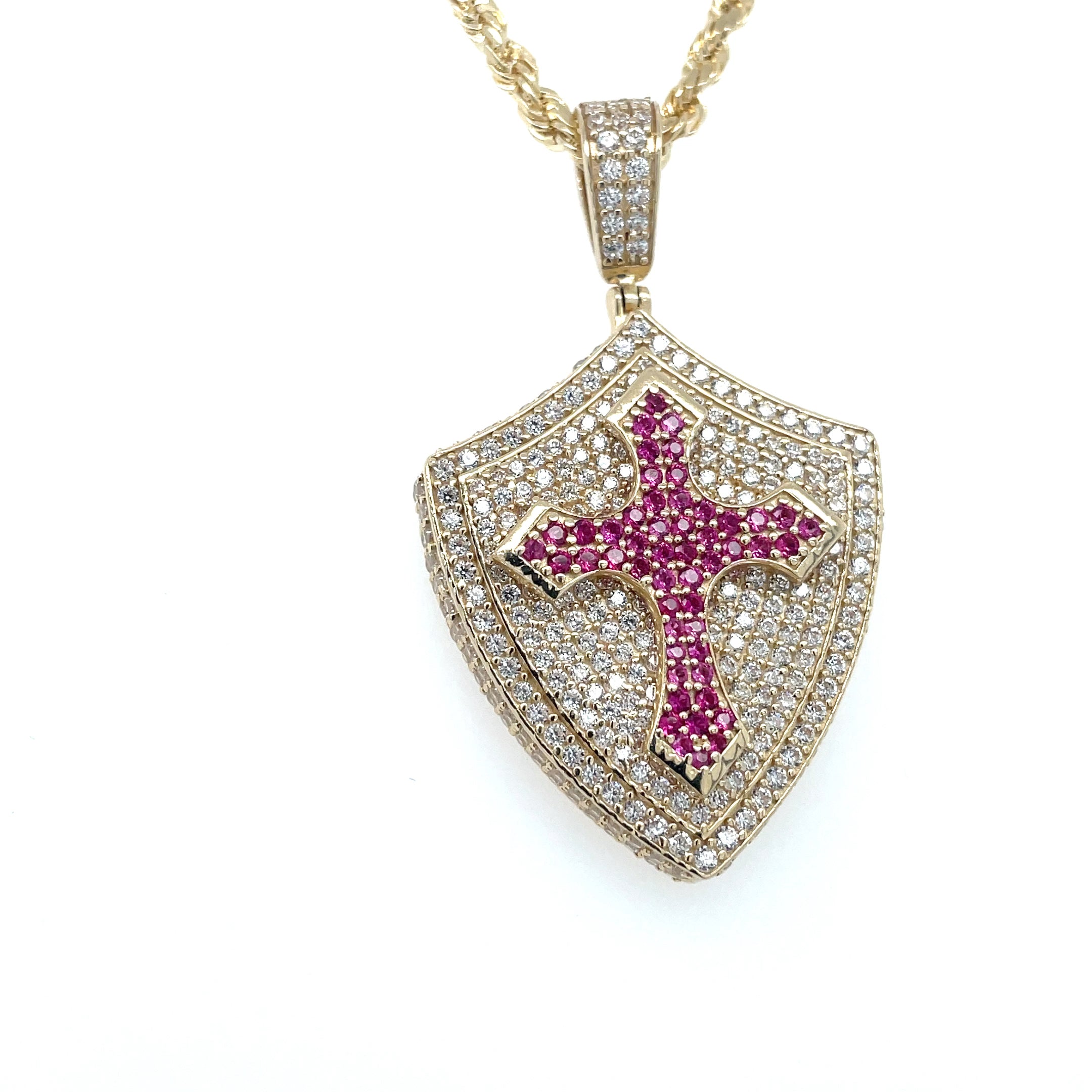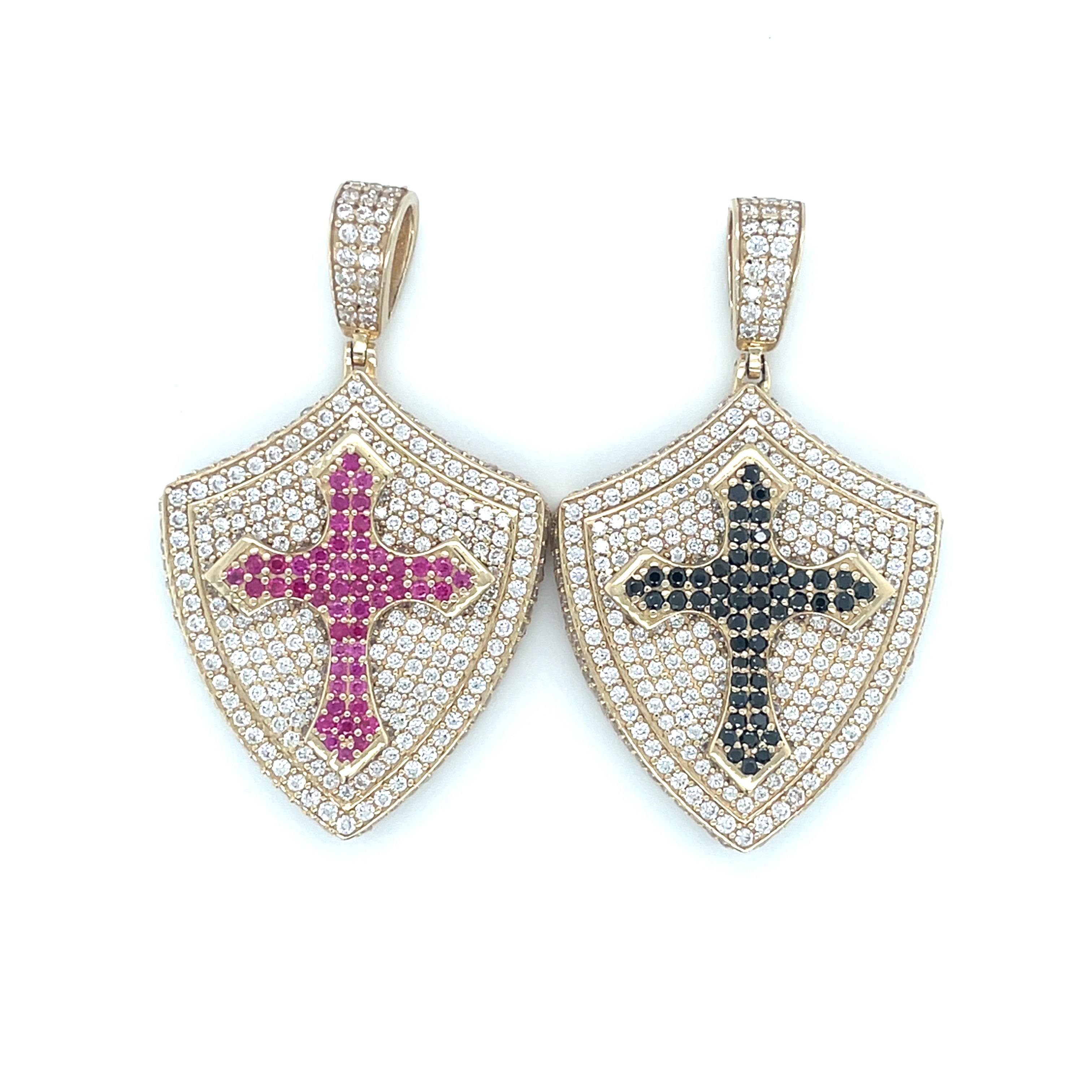 The 14K Yellow Gold Shield Cross Pendant features black/red Cubic Zirconia stones set in a shield-shaped design. The pendant is crafted in yellow gold and adorned with a religious cross motif, making it a meaningful and stylish piece of men's jewelry. The combination of the shield shape, black/red stones, and cross design adds a touch of sophistication and spiritual significance to this pendant.