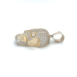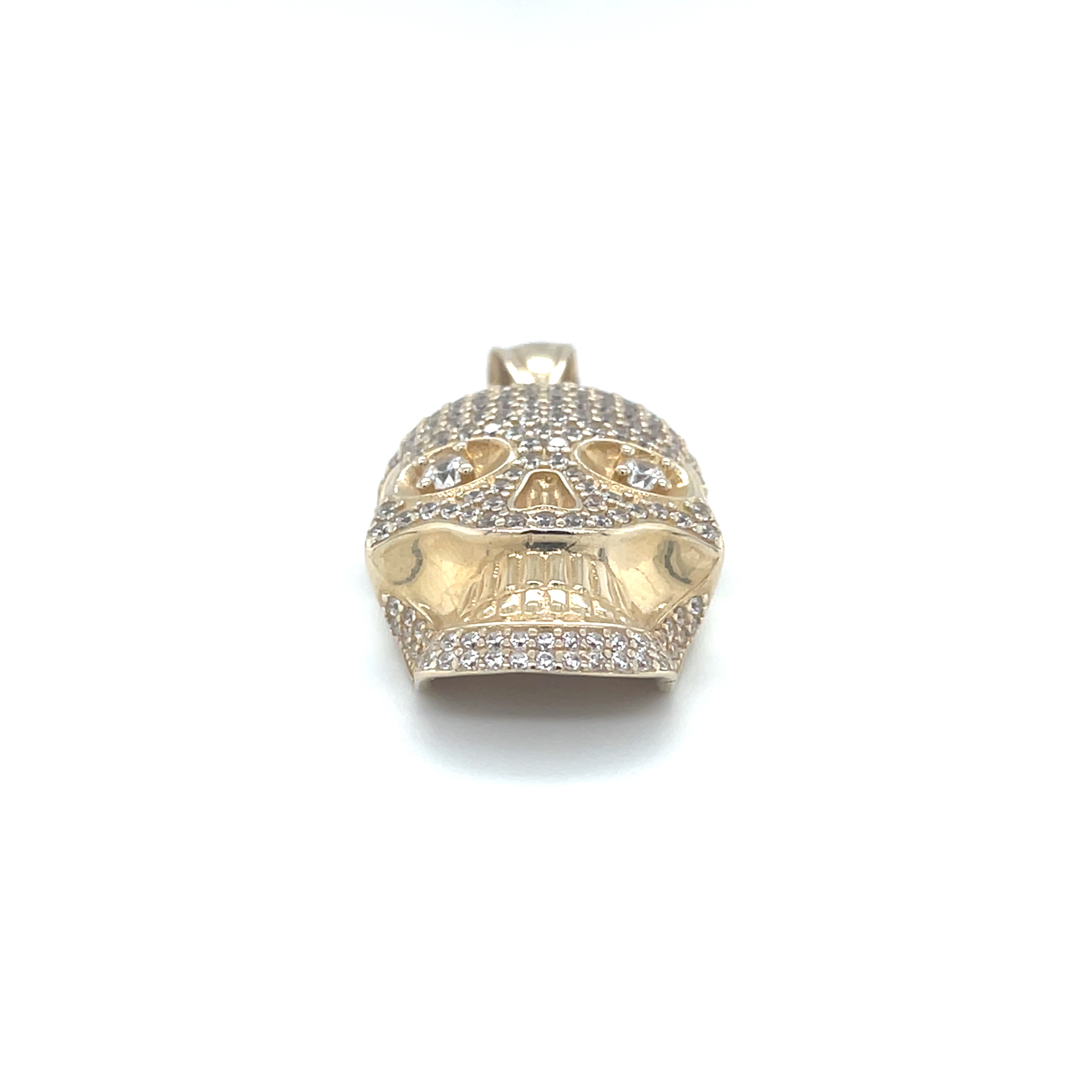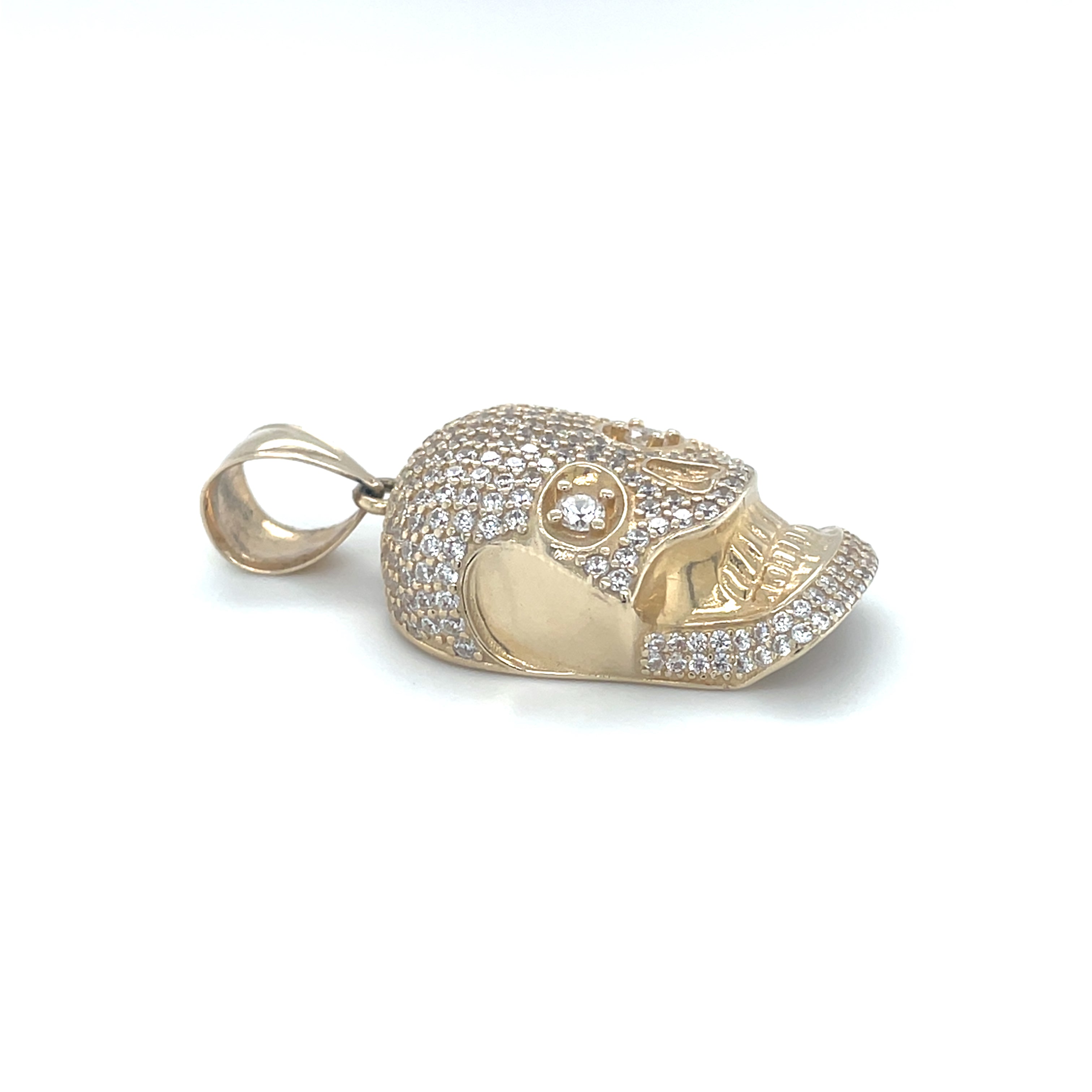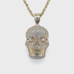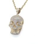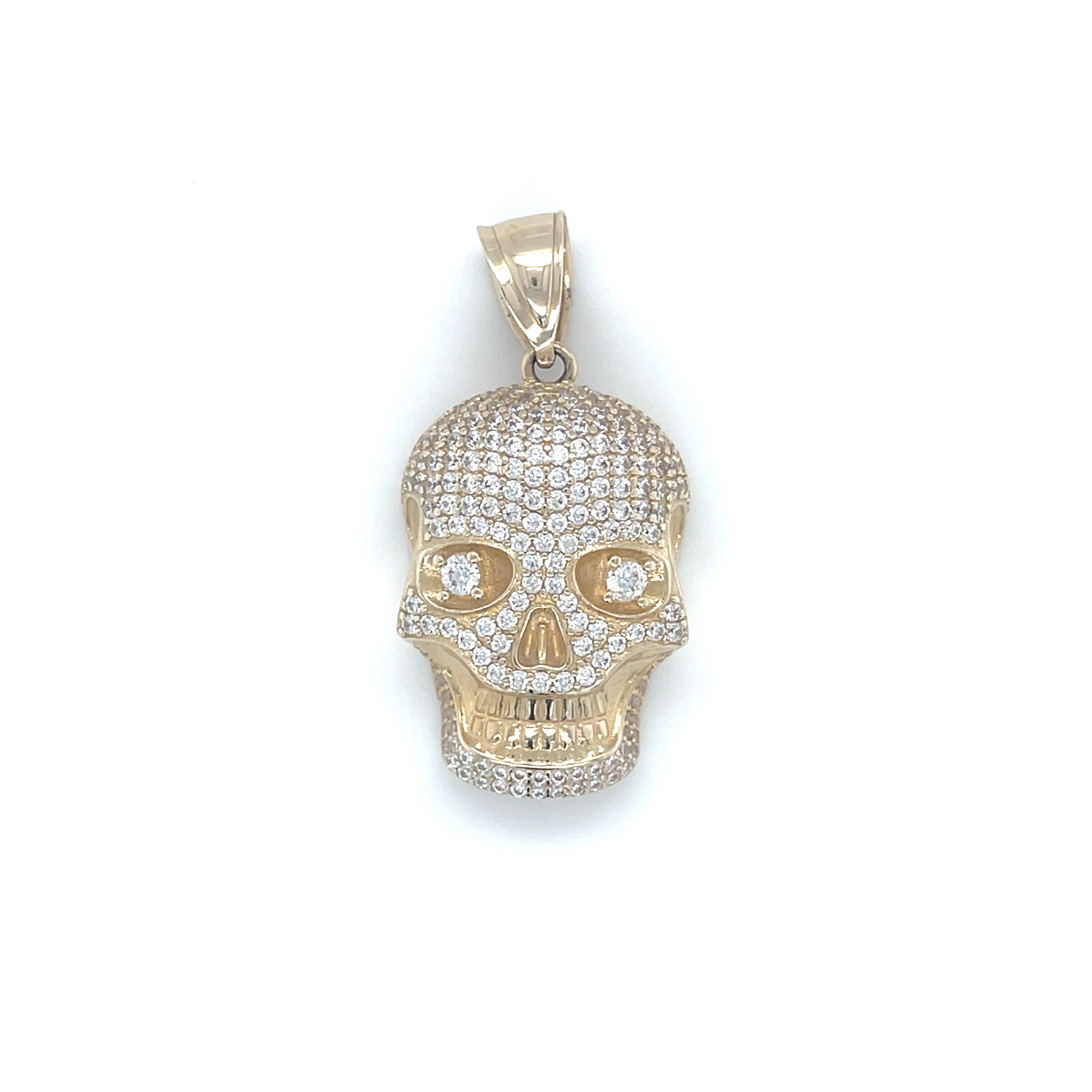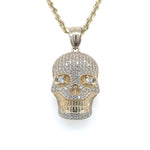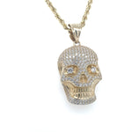 This 14K Yellow Gold Skull Pendant features a unique design with a skull-shaped pendant crafted from yellow gold. The pendant is adorned with sparkling cubic zirconia stones, adding a touch of glamour to the edgy skull motif. With its round main stone shape and gold color, this pendant exudes a bold and stylish look perfect for those with a taste for skeleton-themed jewelry. Ideal for adding a touch of personality to any outfit, this pendant is a standout piece in the realm of fine jewelry.