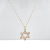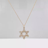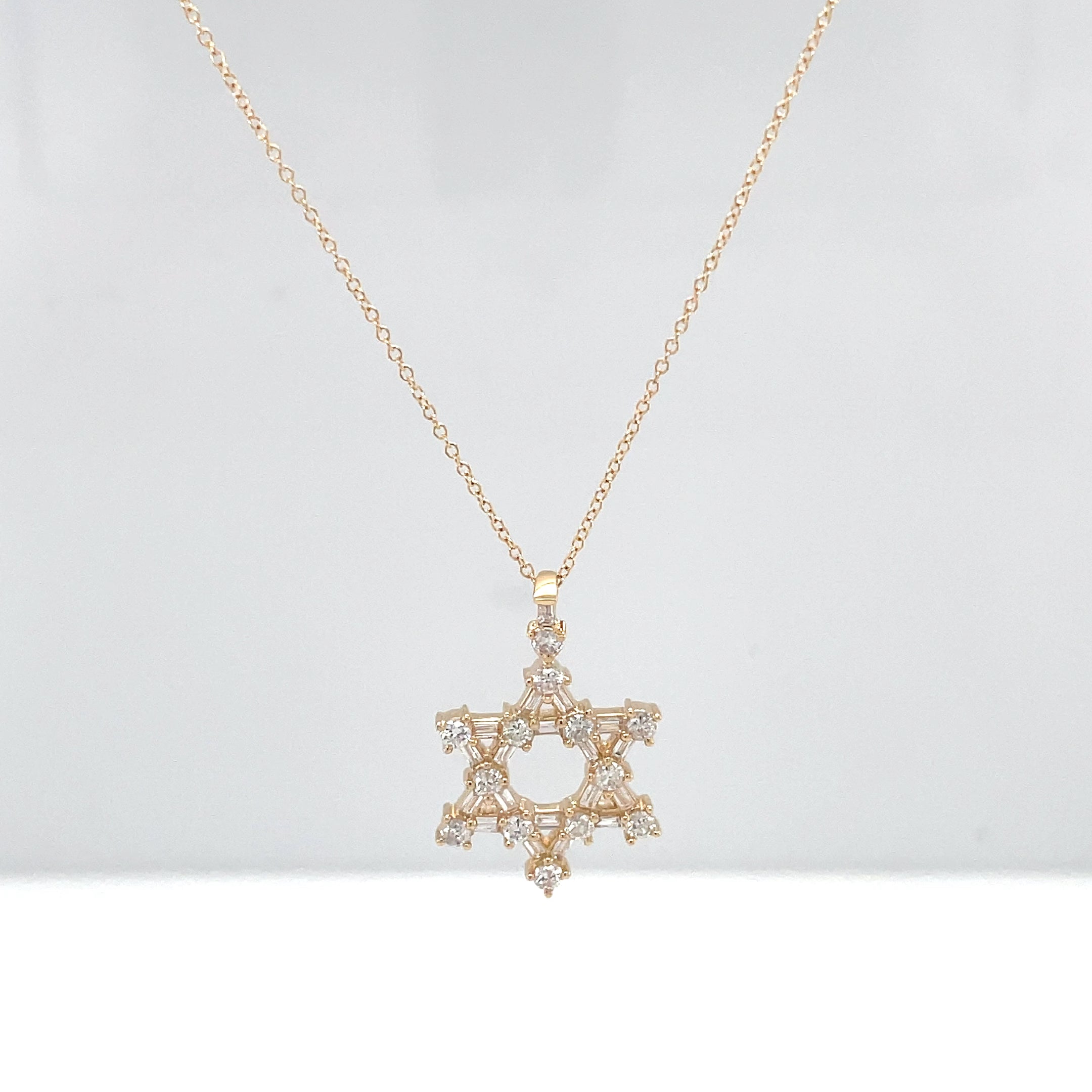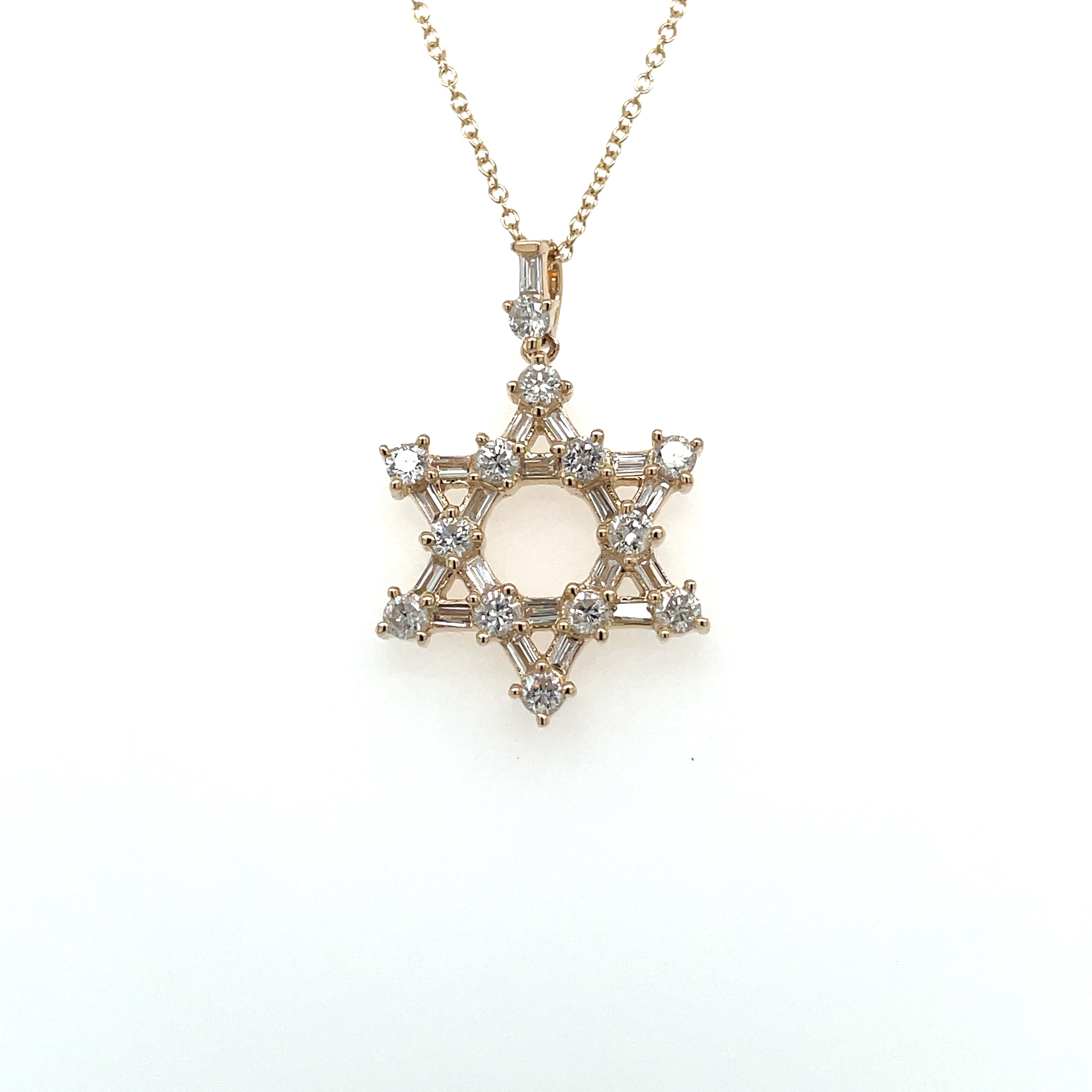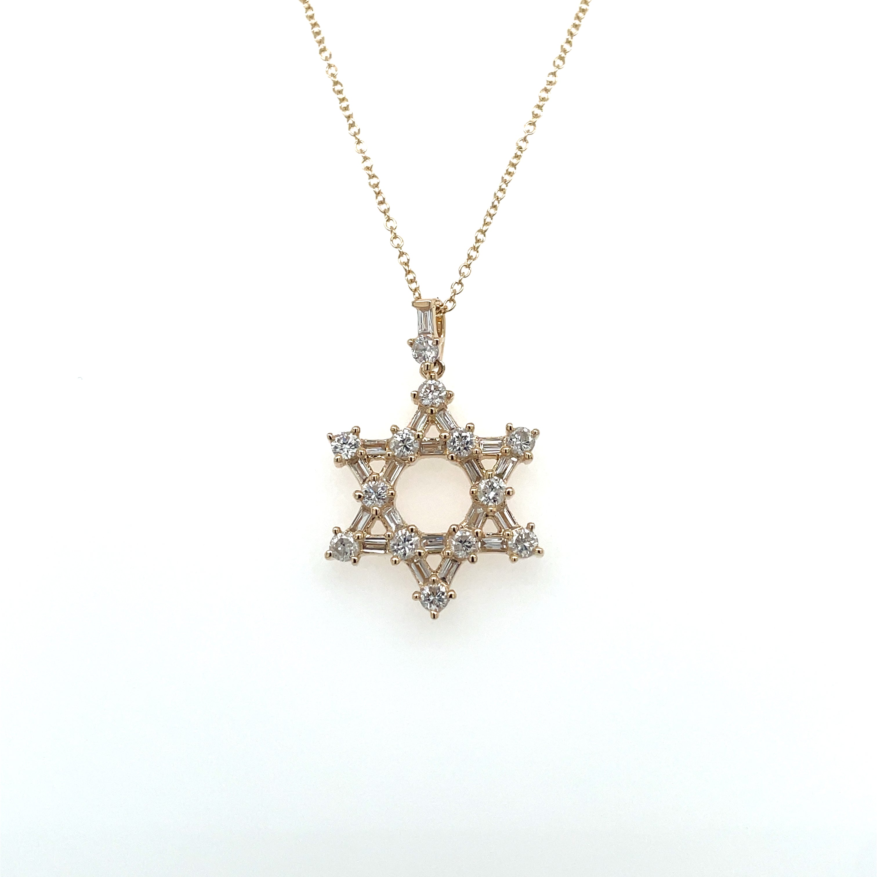 This stunning necklace features a beautiful star-shaped pendant made of 14K yellow gold, adorned with a sparkling baguette diamonds. The pendant hangs from a 16-inch cable chain that complements the gold tone of the pendant. The necklace has a religious theme and is made in the United States.