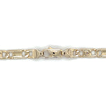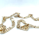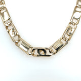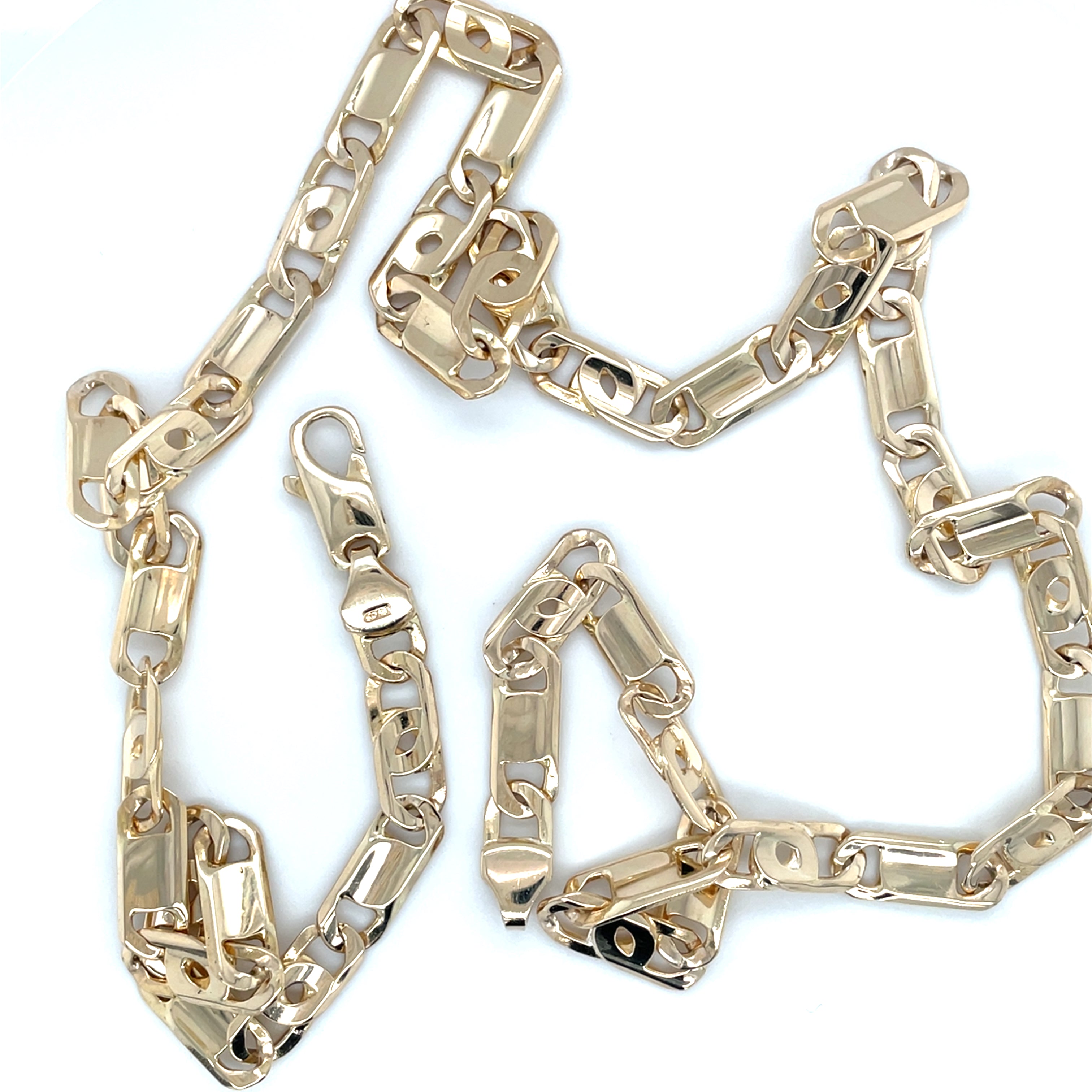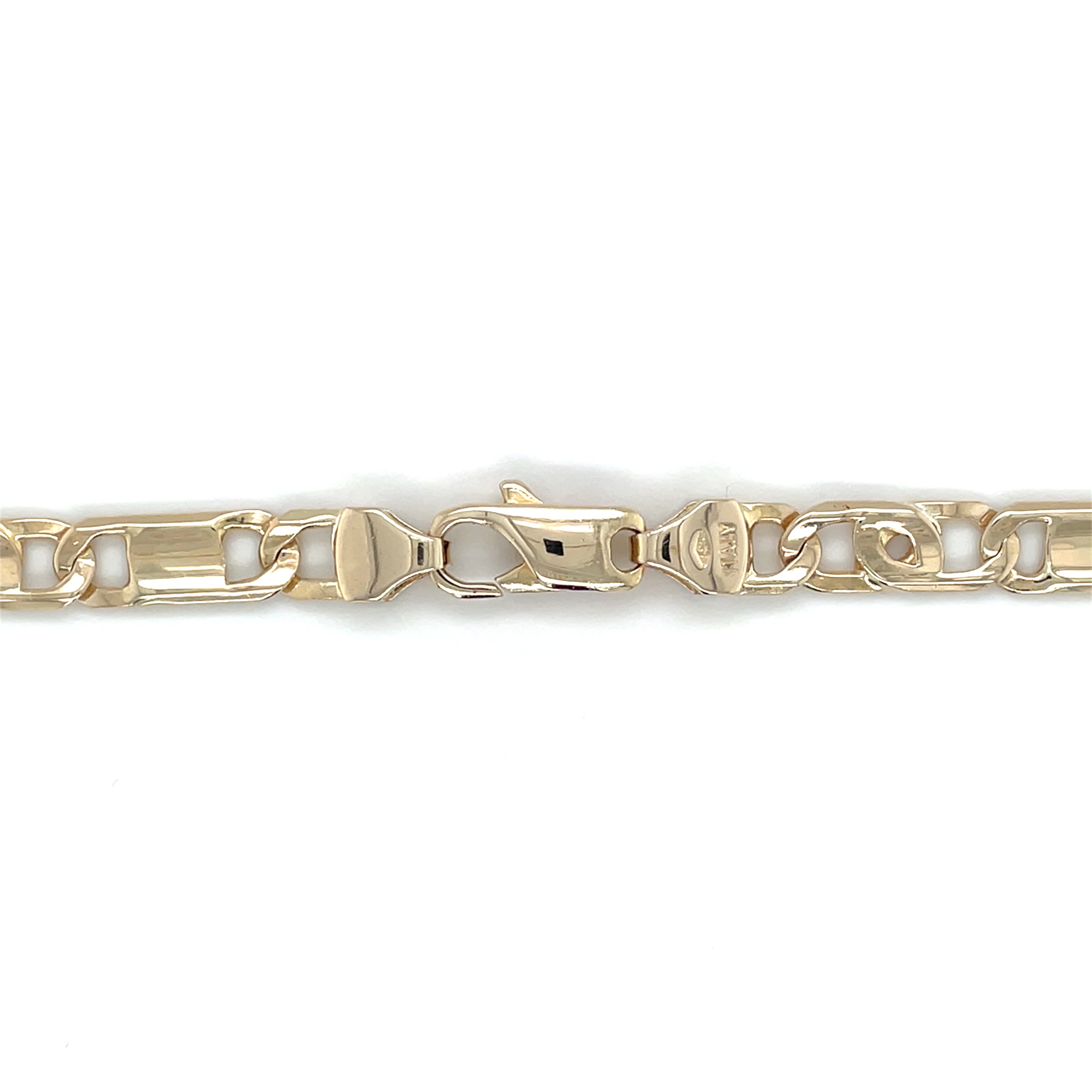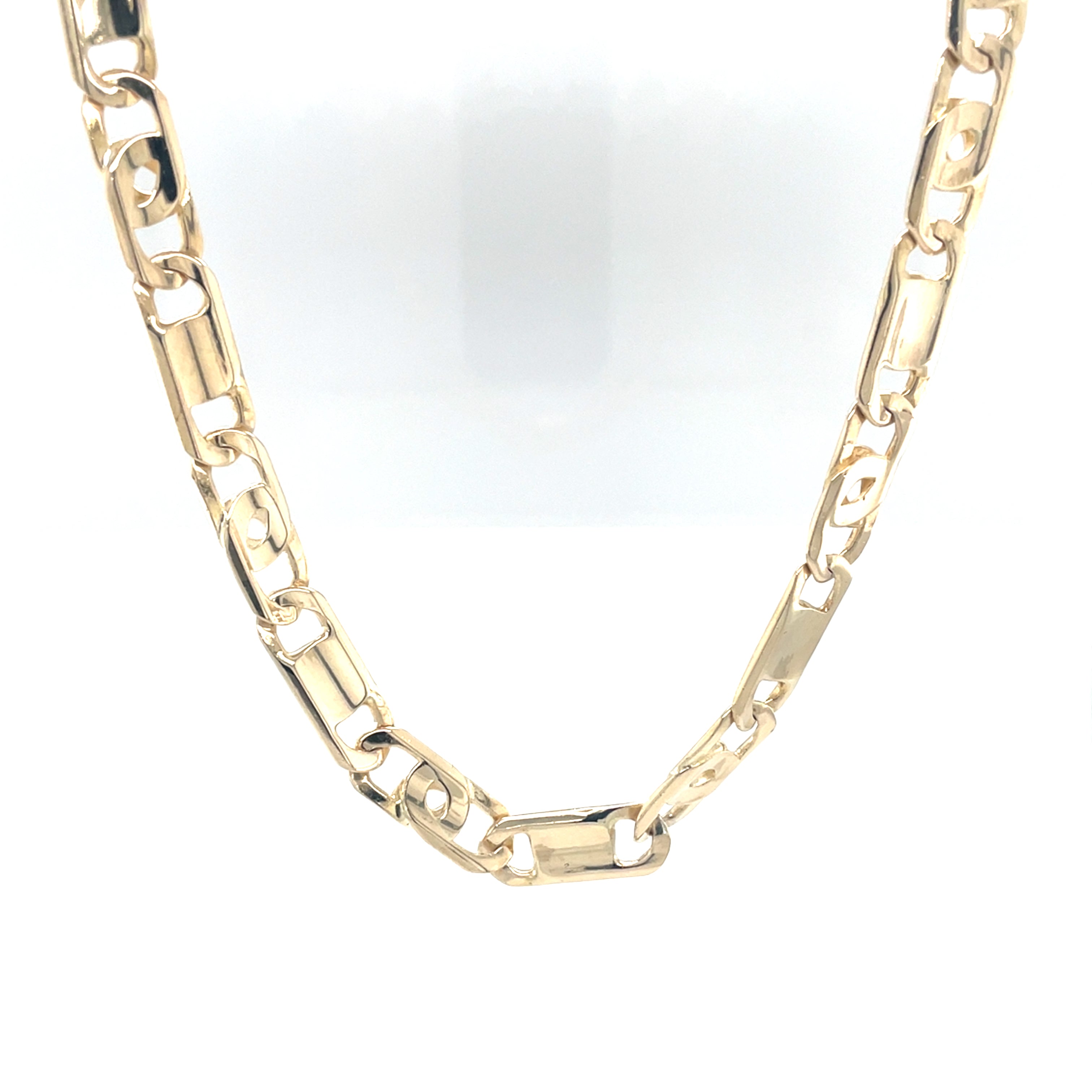 This is a 14K yellow gold necklace from Italy featuring a unique Tiger Eye link chain design. The necklace has a length of 24 inches and a width of 7mm, making it a bold and stylish piece of fine jewelry. The lobster closure ensures secure wearing, while the absence of any stones gives it a sleek and modern look. Perfect for those who appreciate quality craftsmanship and want to add a touch of luxury to their outfit.